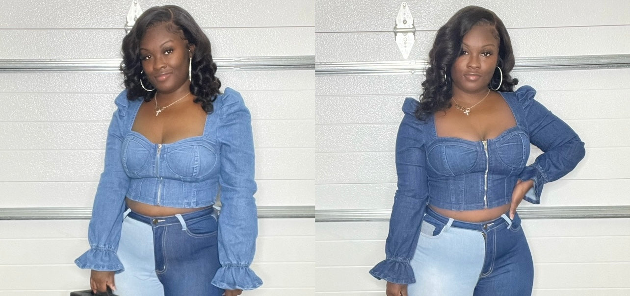 Denim puff shoulder, flare at arm blouse. Zips in front.Minimum stretch.