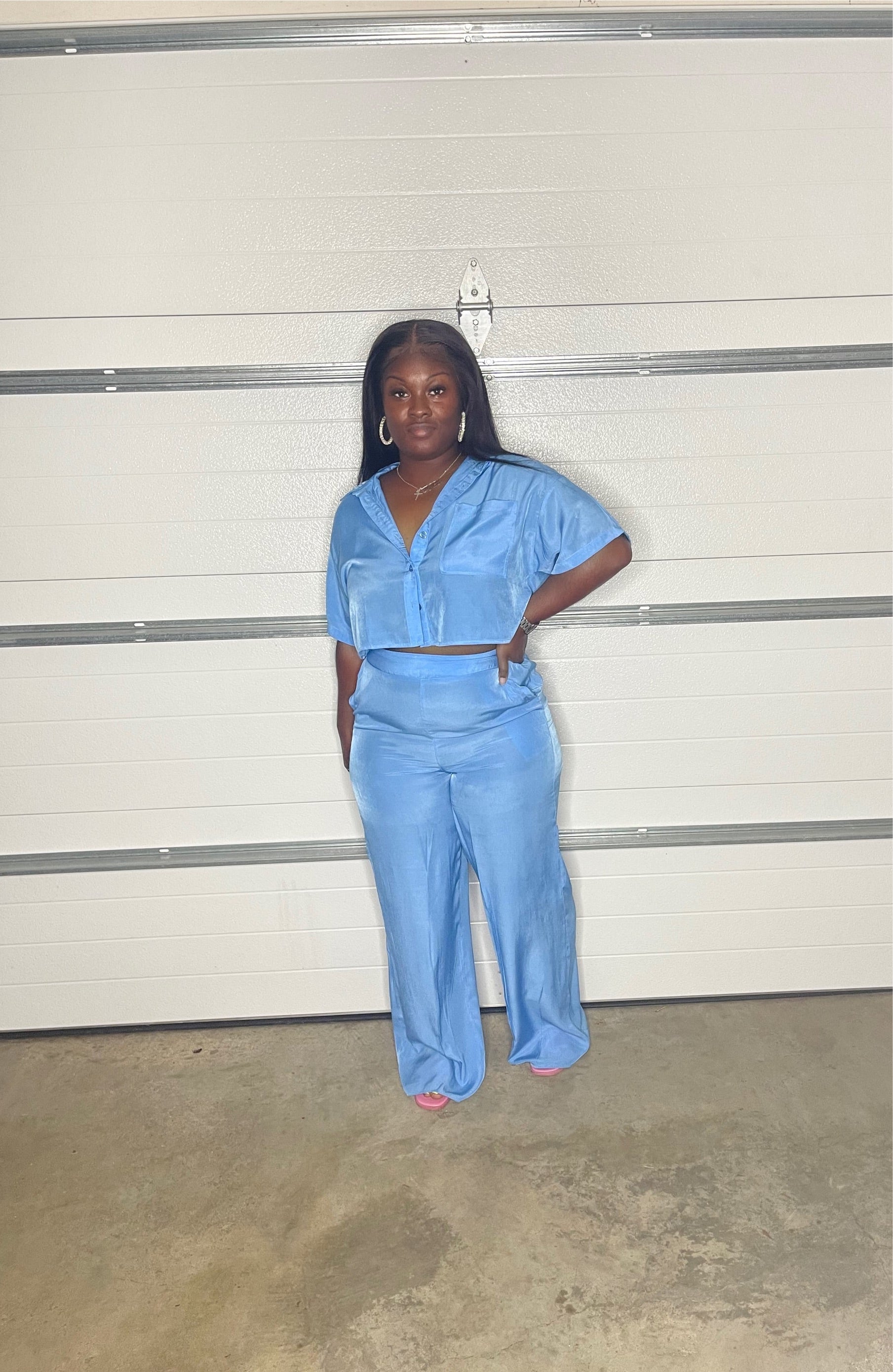 Two- Piece Set. Crop button down top with wide leg bottoms. Elastic waist band.
