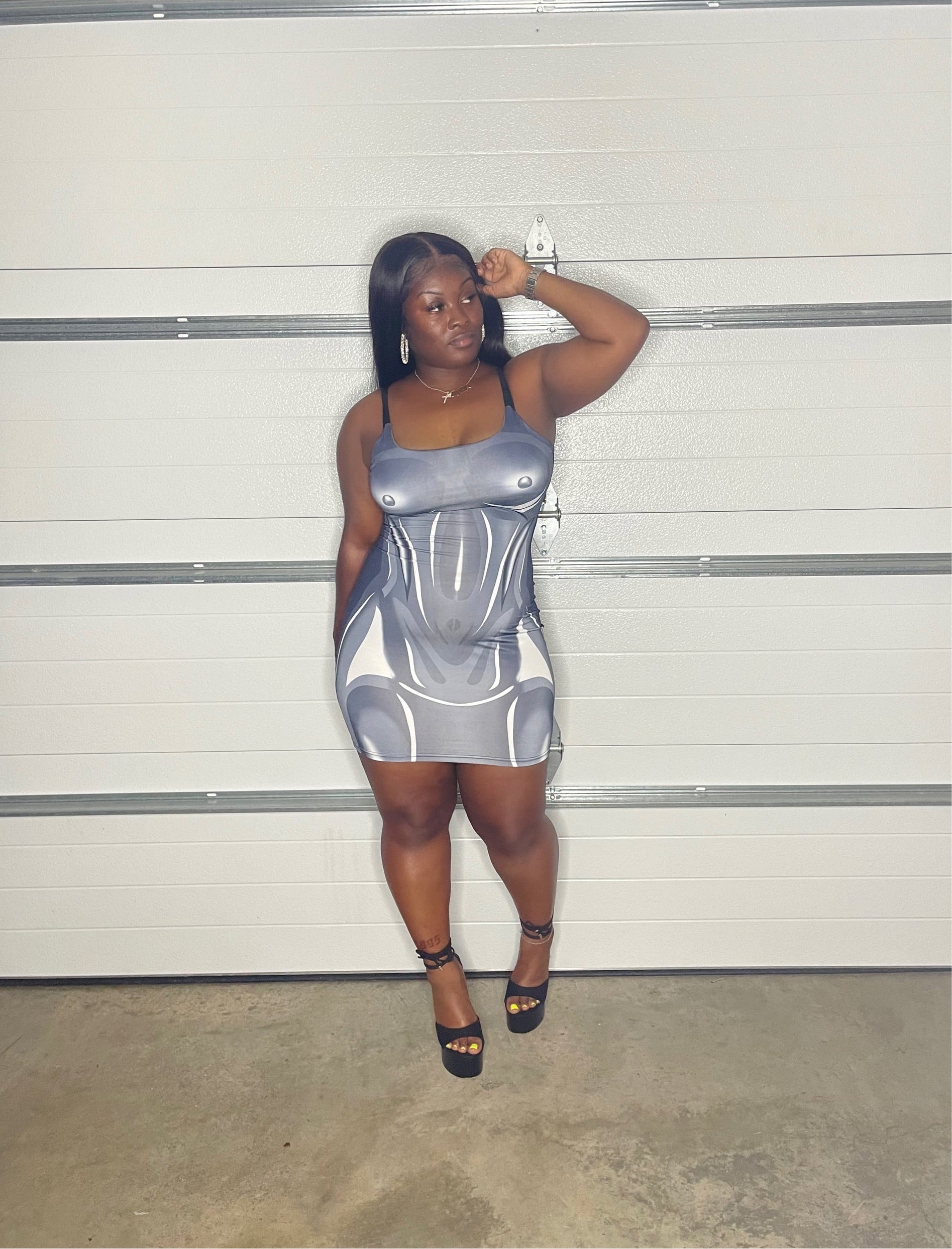 Mini graphic body dress. Adjustable shoulder straps. Has stretch.
