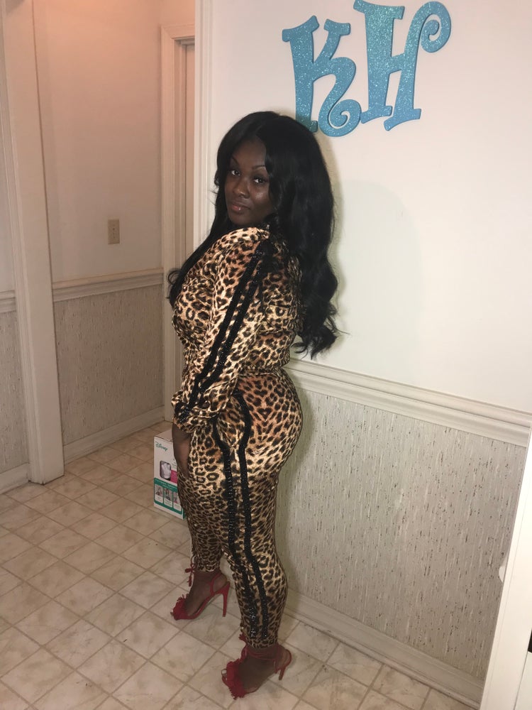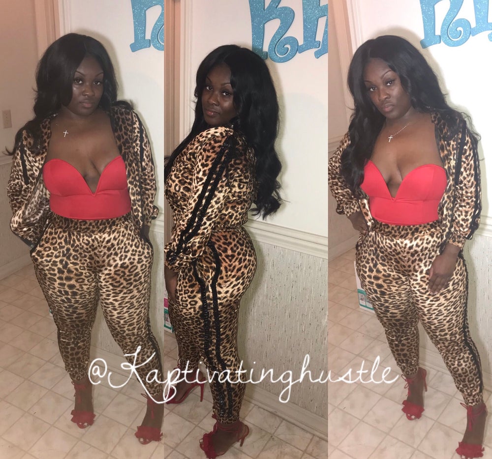 Leopard 2piece Set with black shimmer stripes on jacket and pants leg! Add this hot 2 piece to your wardrobe