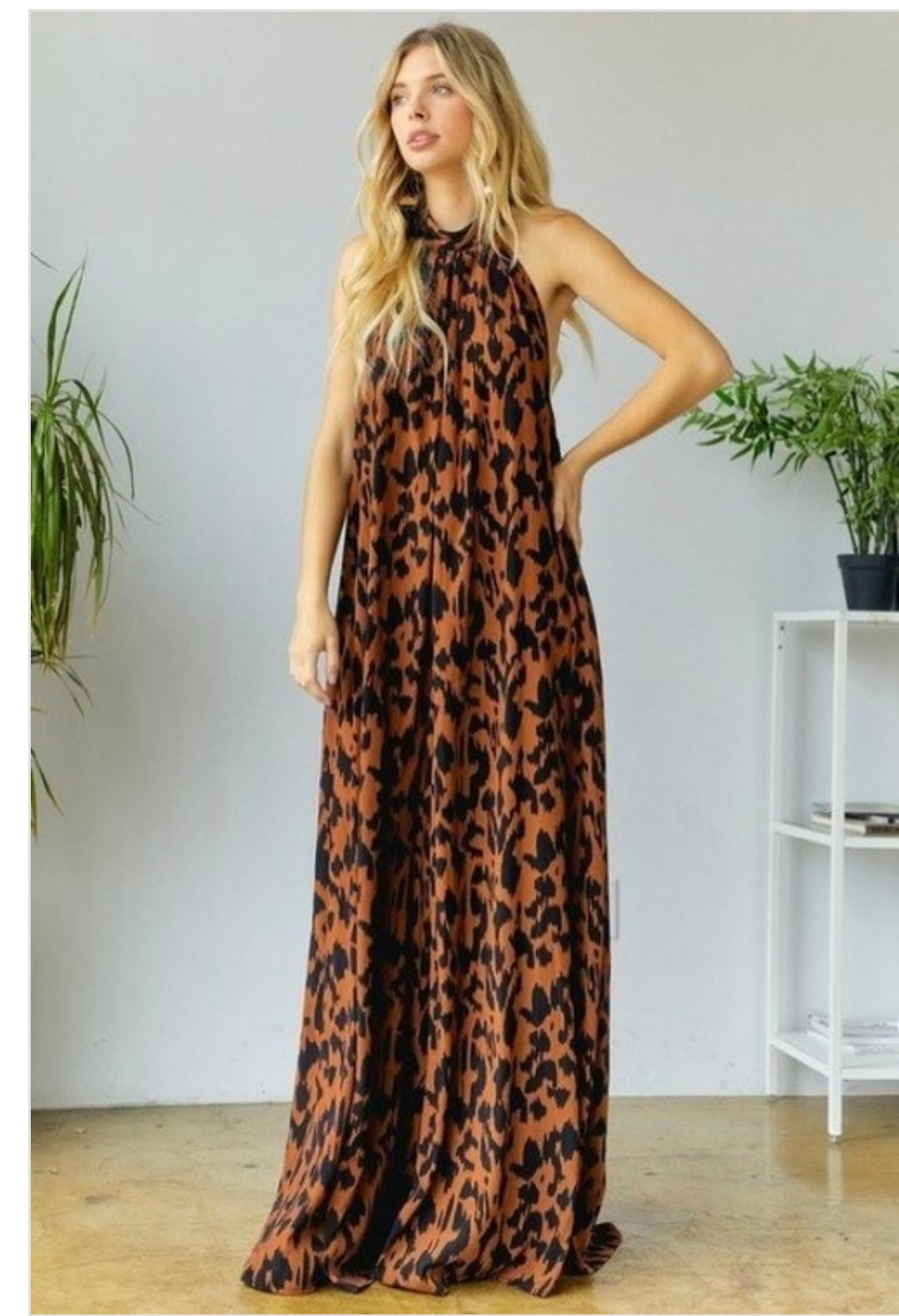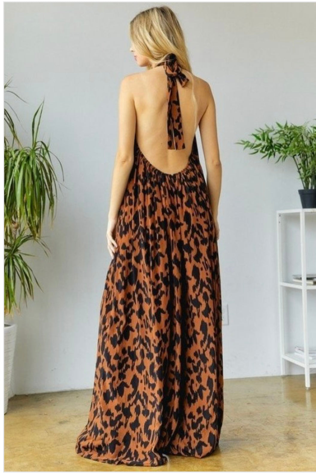 One-piece flare jumpsuit. Halter neck opens to lower back. Recommend go down a size