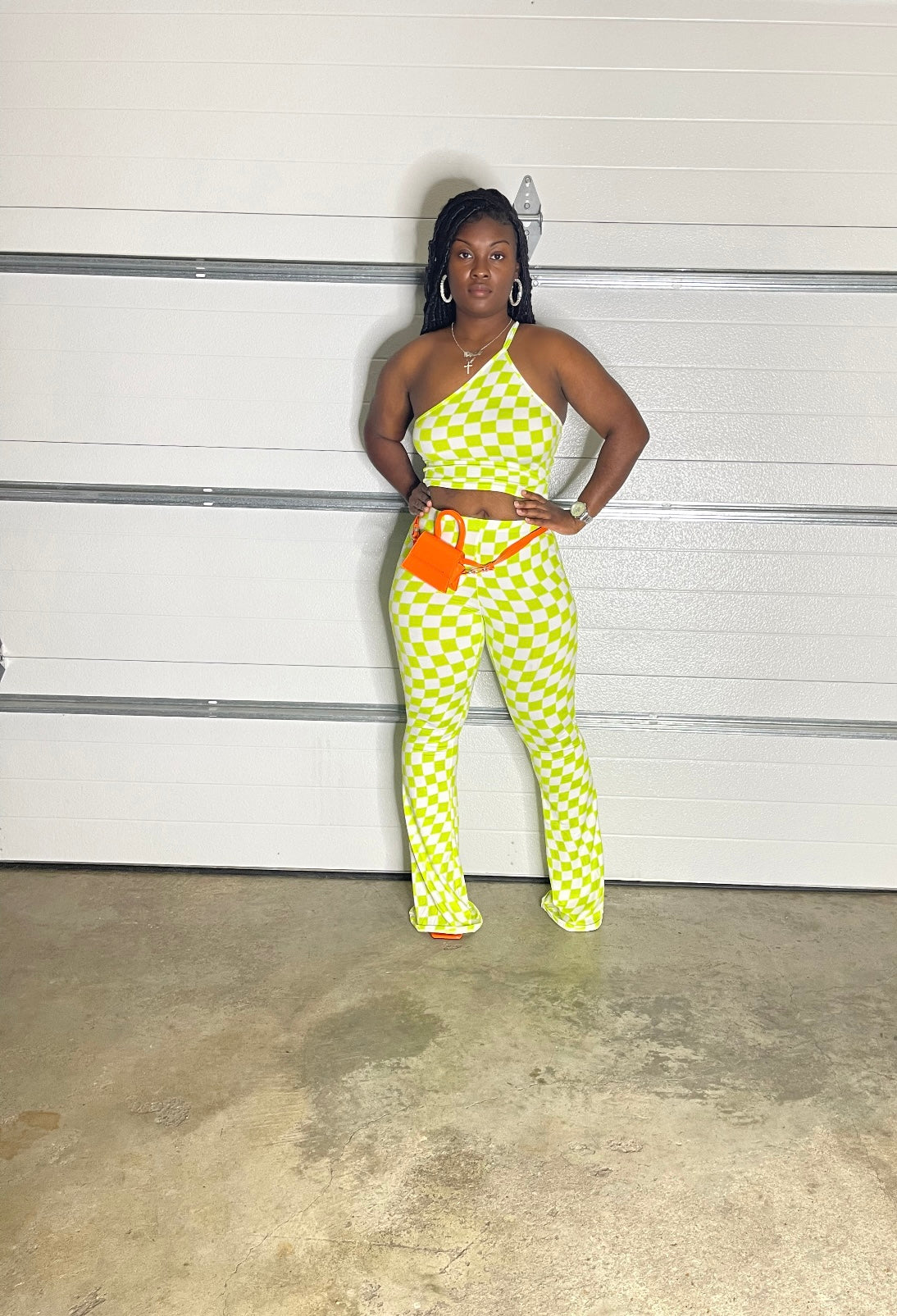 Two-piece checker set. Top: Crop with side straps. Bottoms: Flare, Tall girl friendly. Outfit has amazing stretch.
