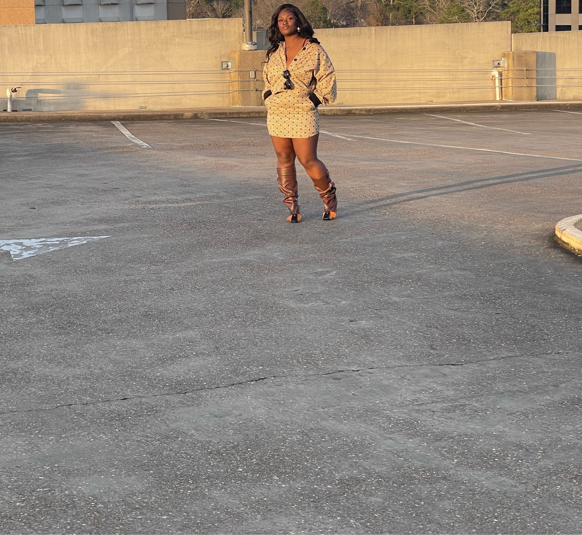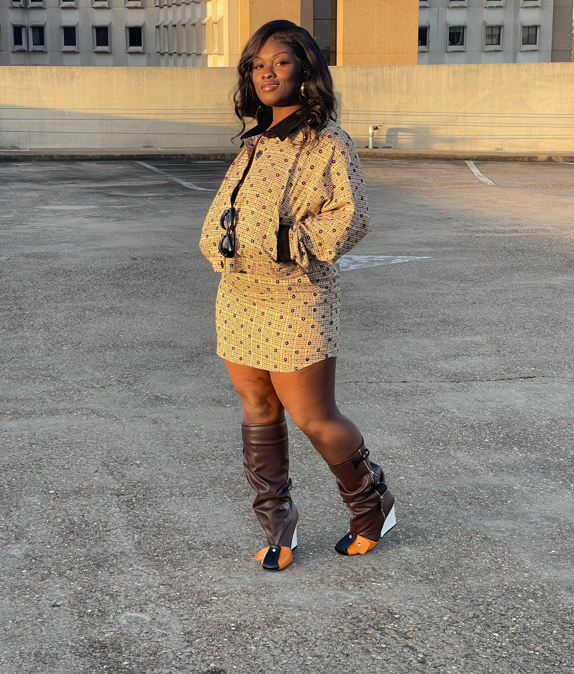 Two-piece plaid and flower set. Oversized Jacket with corduroy collar and two pockets. Matching high waist skirt with side pockets, zips in back, lined. Minium stretch.