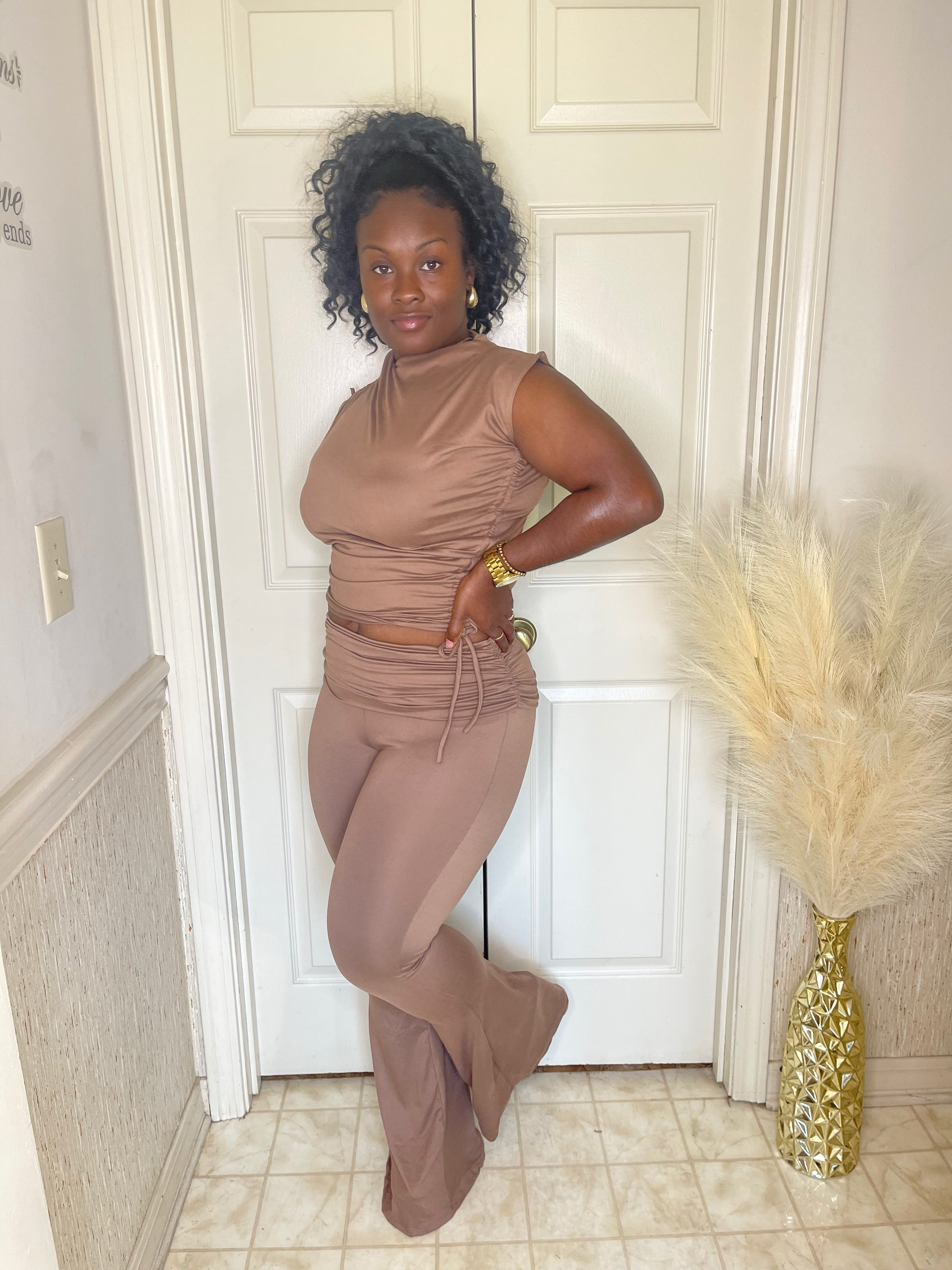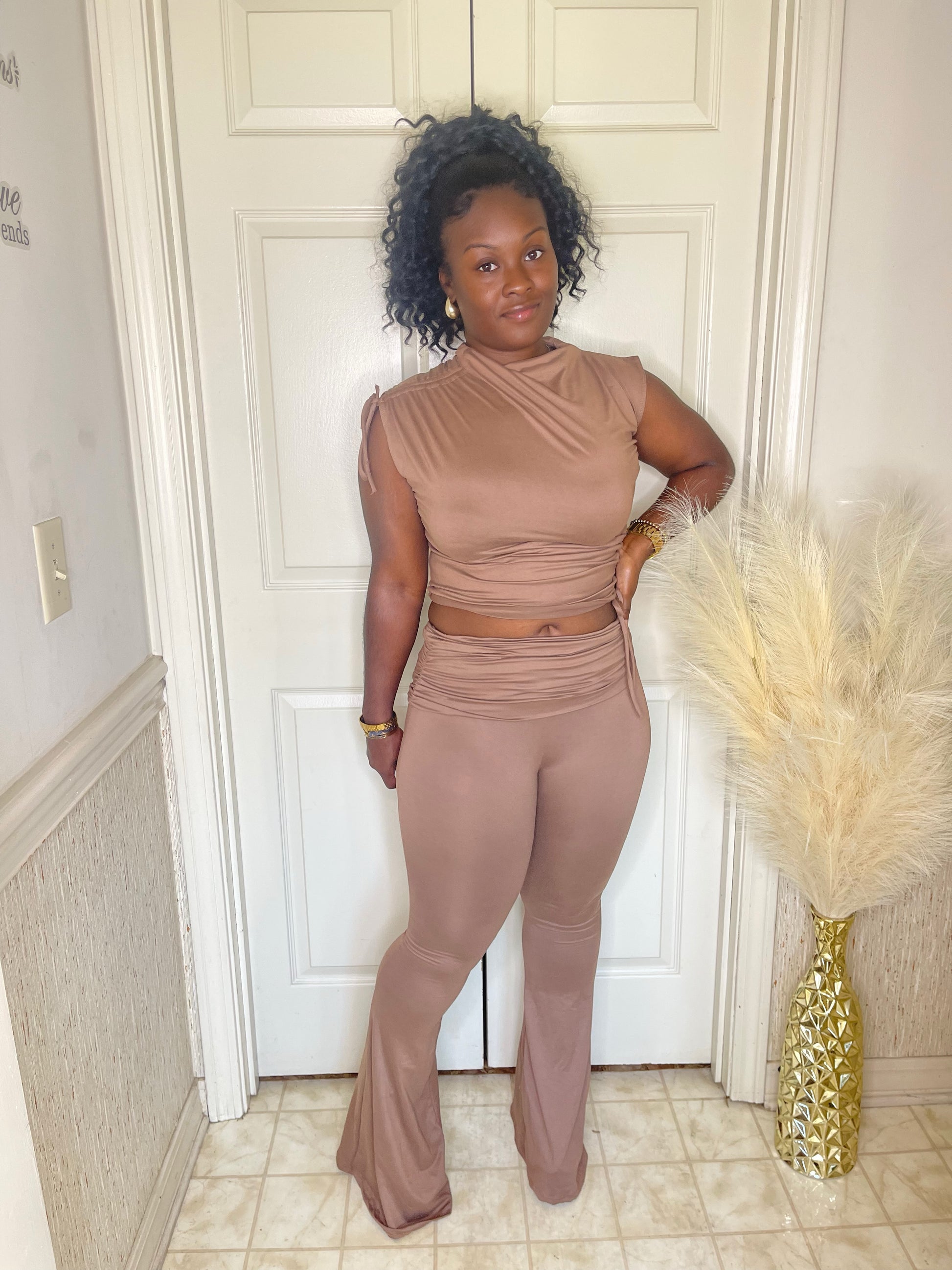 This set features a mock neck top with a drawstring that adds to its scrunch appeal, paired with bell bottom pants that have a fold over detail. Made with stretch for added comfort.