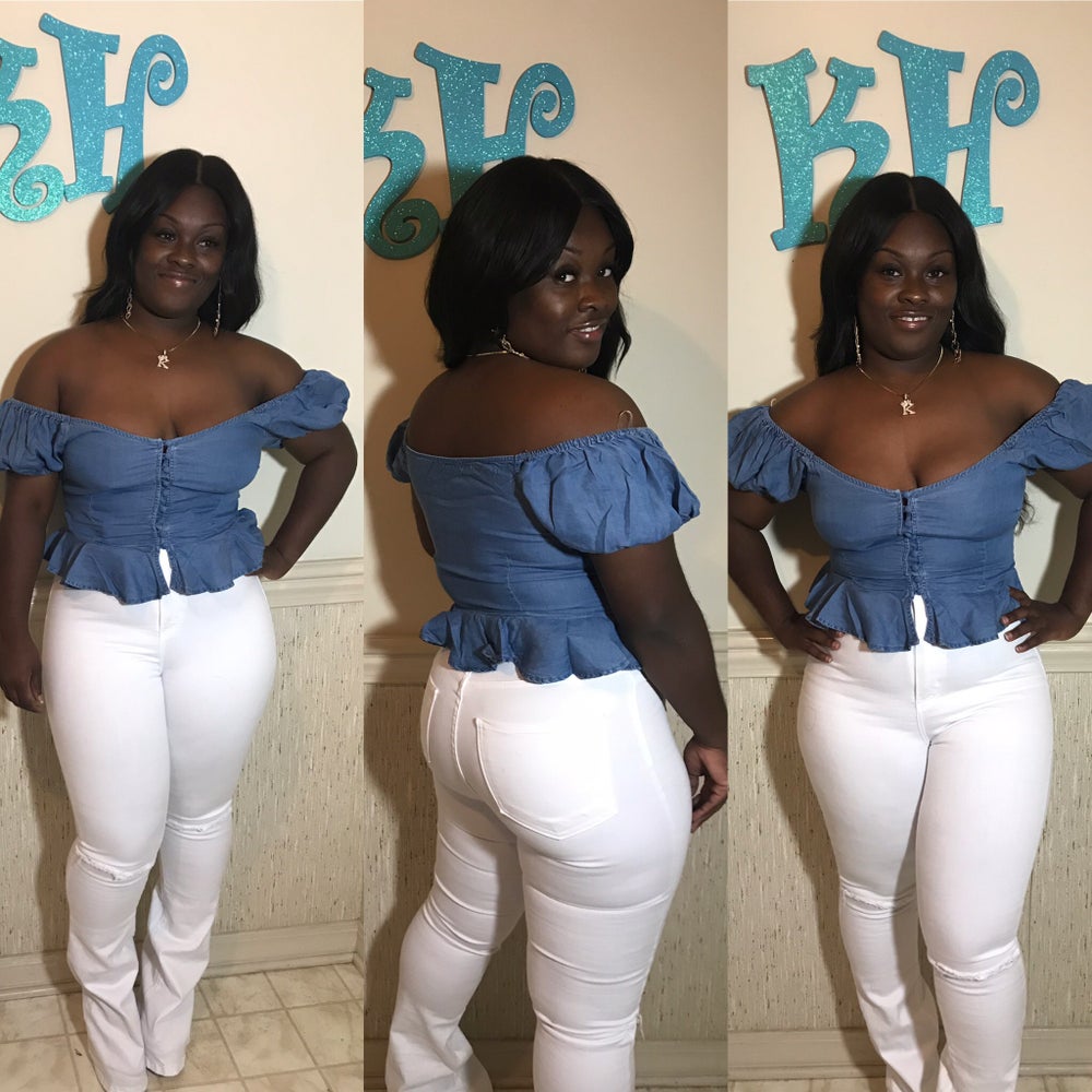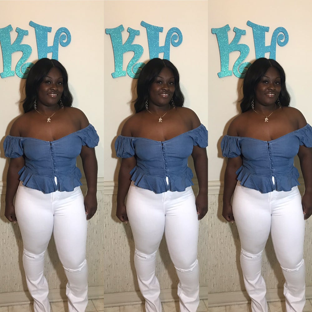 Off shoulder Denim shirt. No stretch. Good stretch around arms