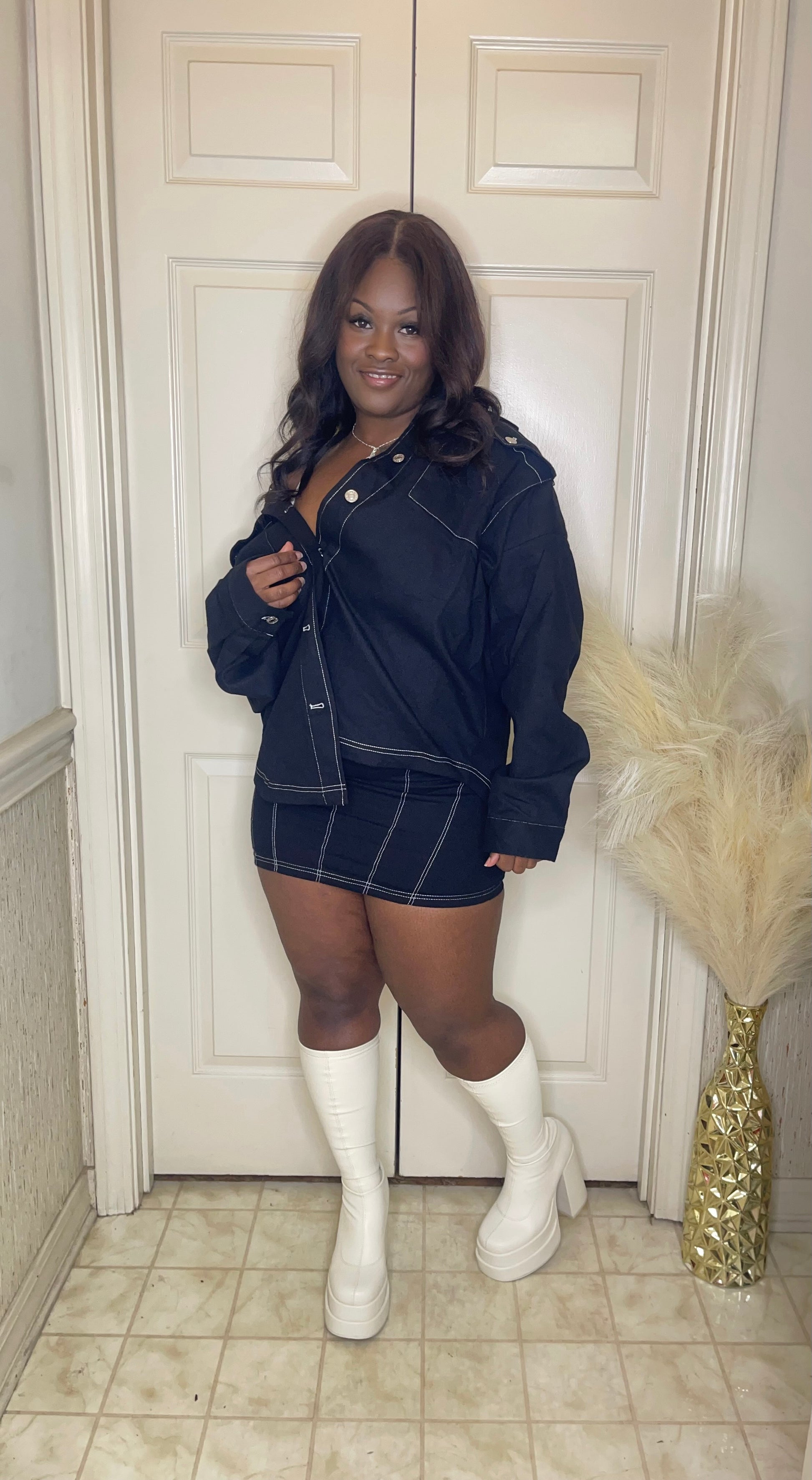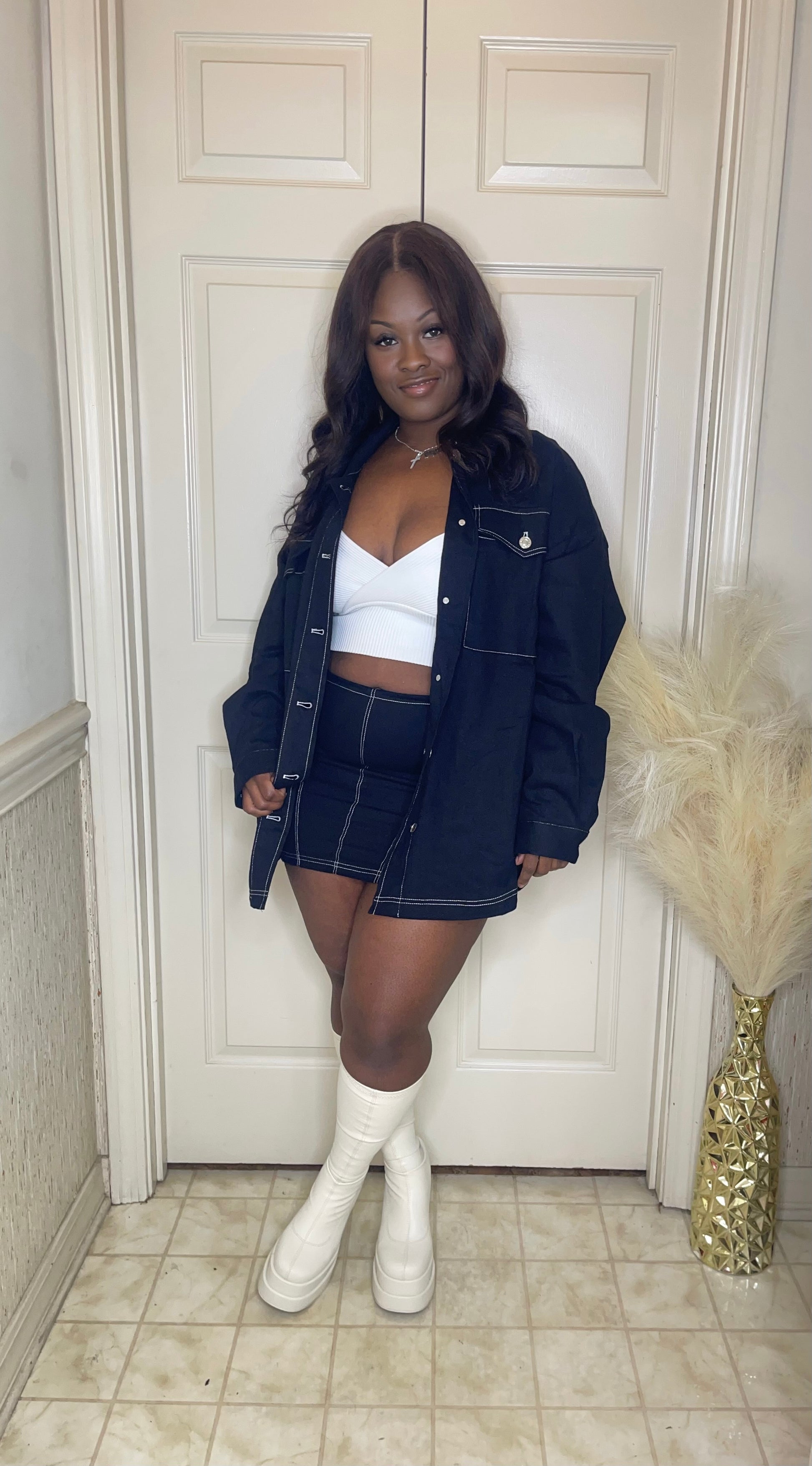 Two-piece Jean set. Stitch detail loose fit shacket and mini skirt set functional chest pockets - Stitch line details - Zipper on back side of skirt - Semi stretchy