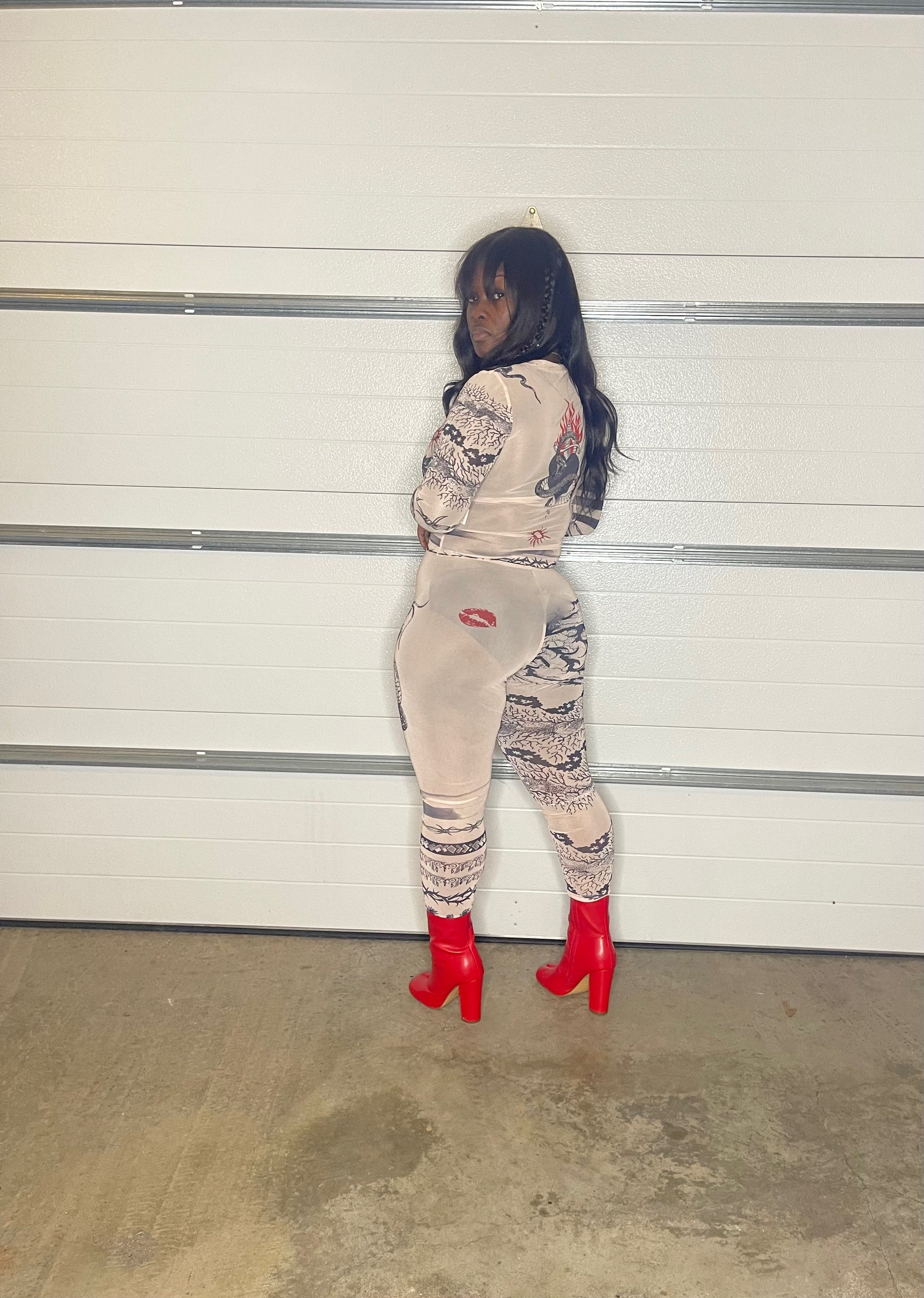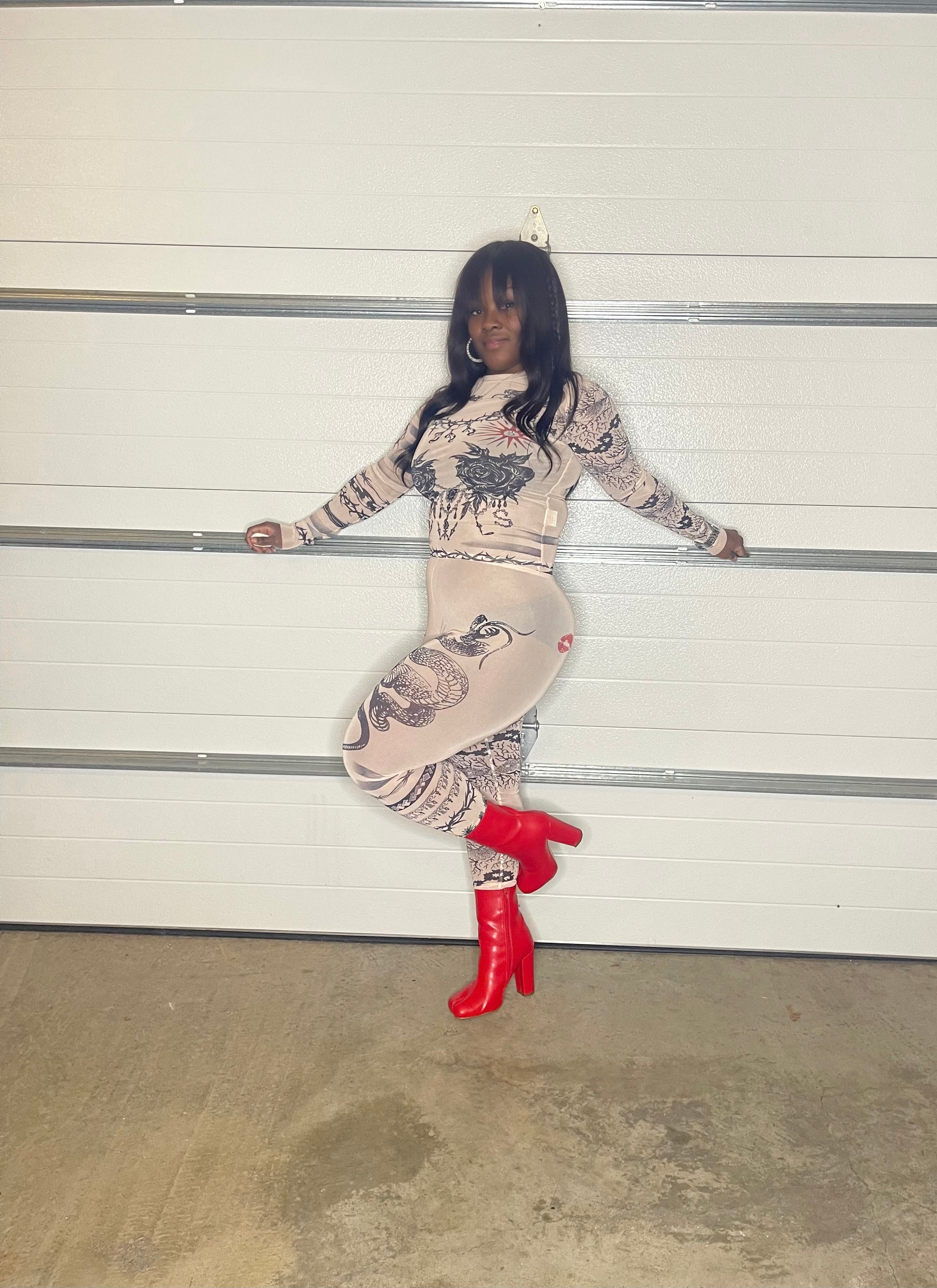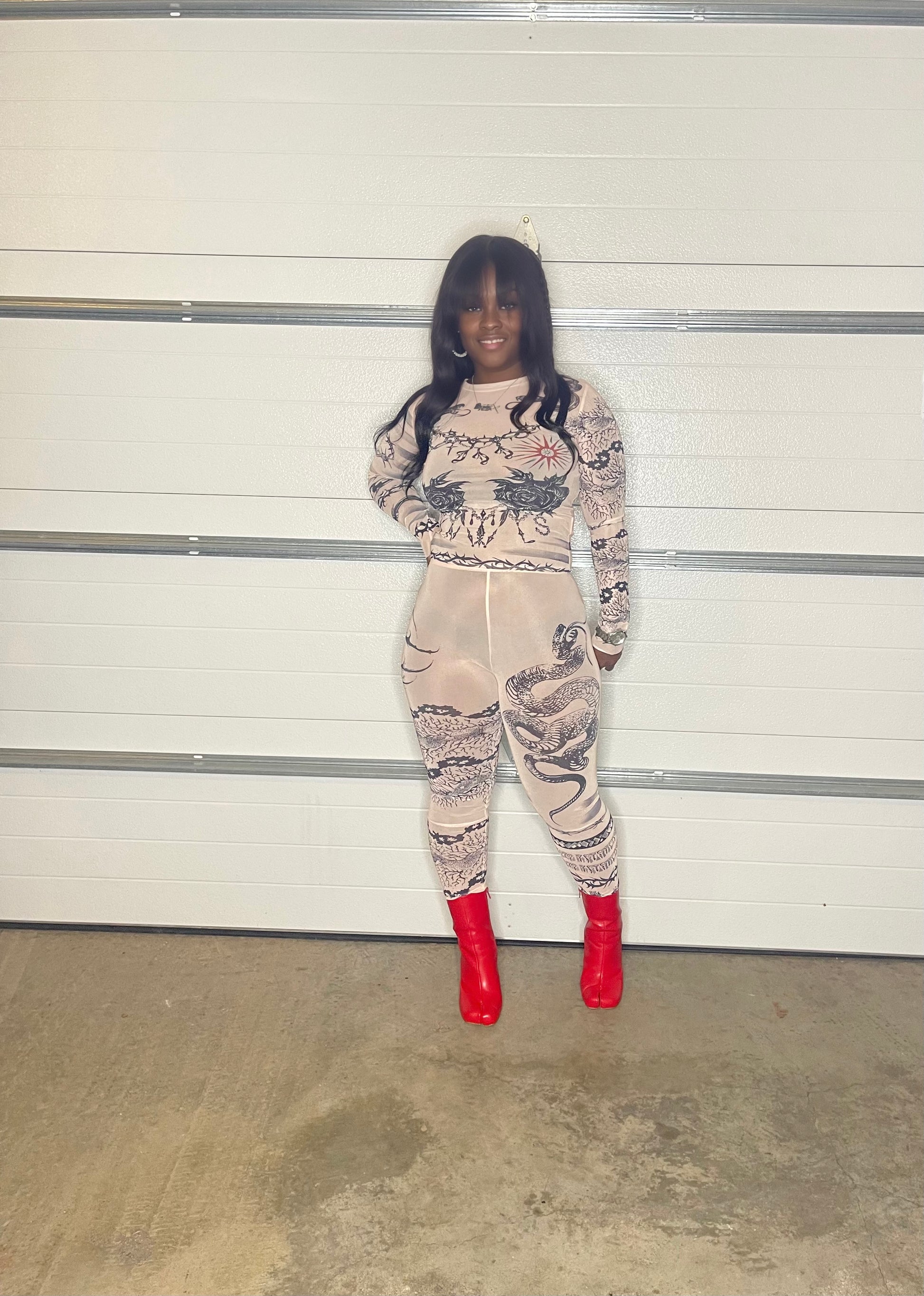 Two-piece mesh set. All over tattoo graffiti print. Great stretch