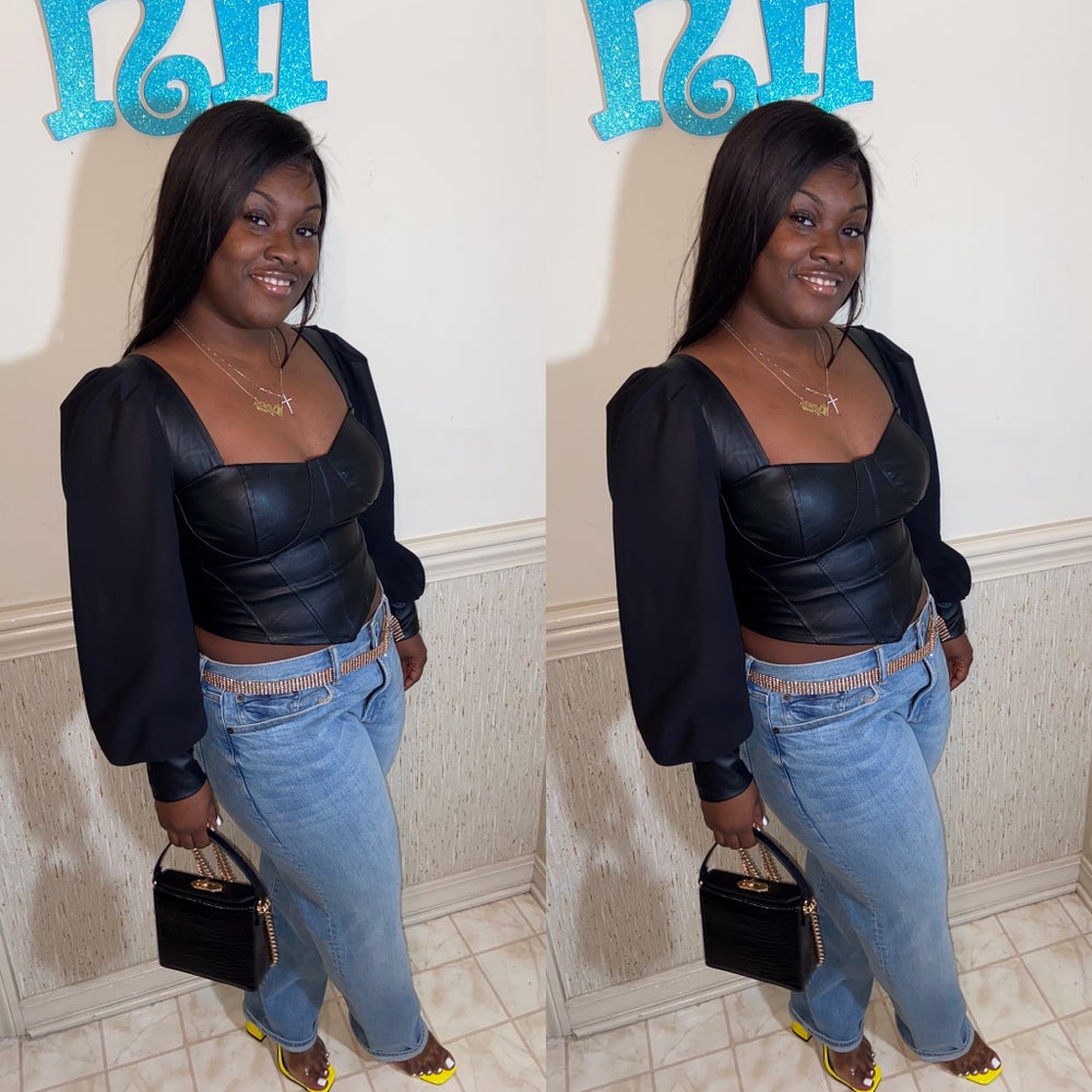 Leather corset top with sheer long sleeves. Zips up in back. Recommend size up if full top