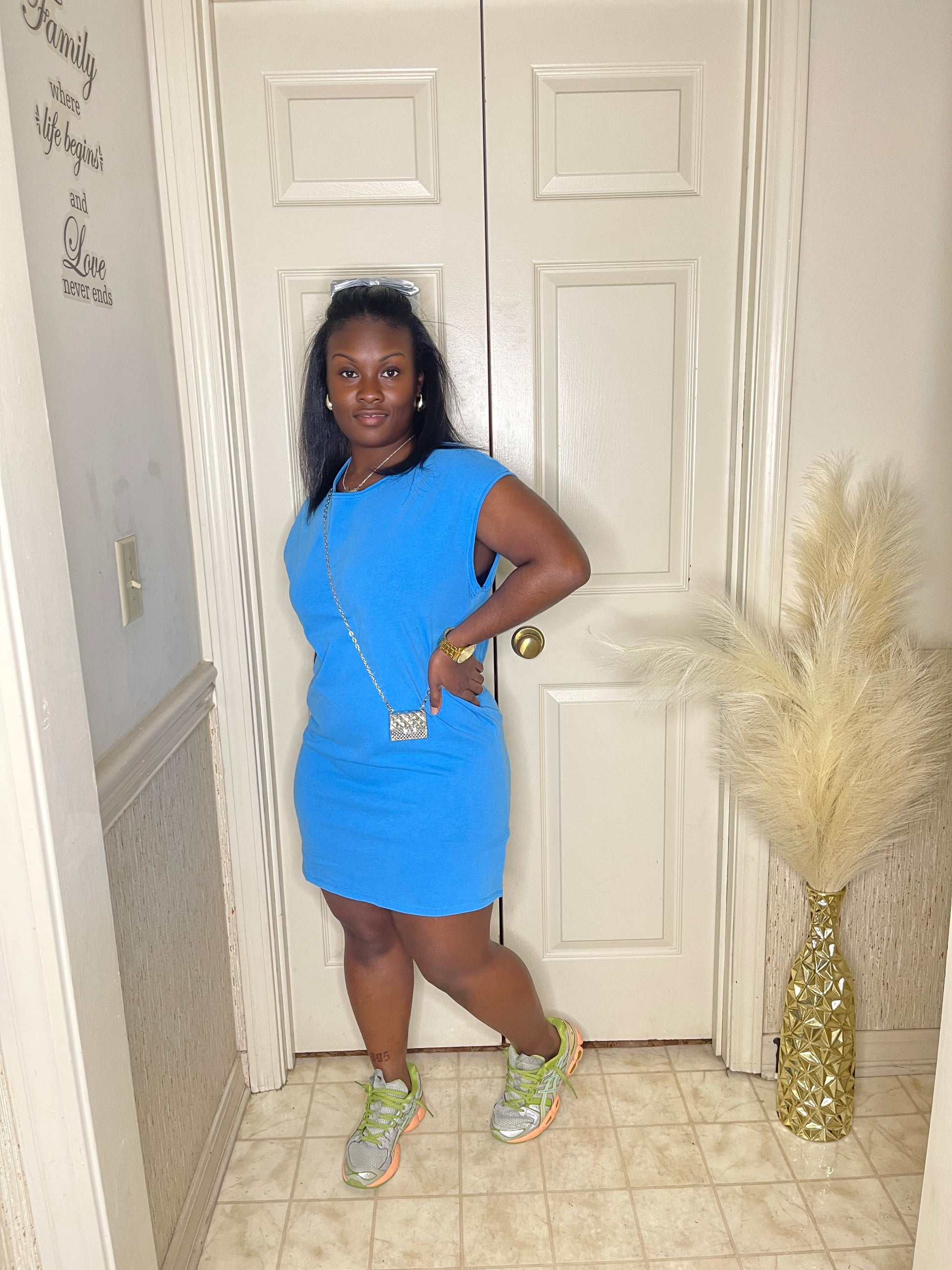LIVE FREELY IN THIS RELAXED MINI DRESS THAT SHAPES A ROUND NECKLINE OVER A WIDE CUT AND SLEEVELESS BODICE WITH WIDE ARMHOLES. A SHIFT SILHOUETTE EXTENDS INTO A MINI HEM, GIVING A SUPER RELAXED STYLE.