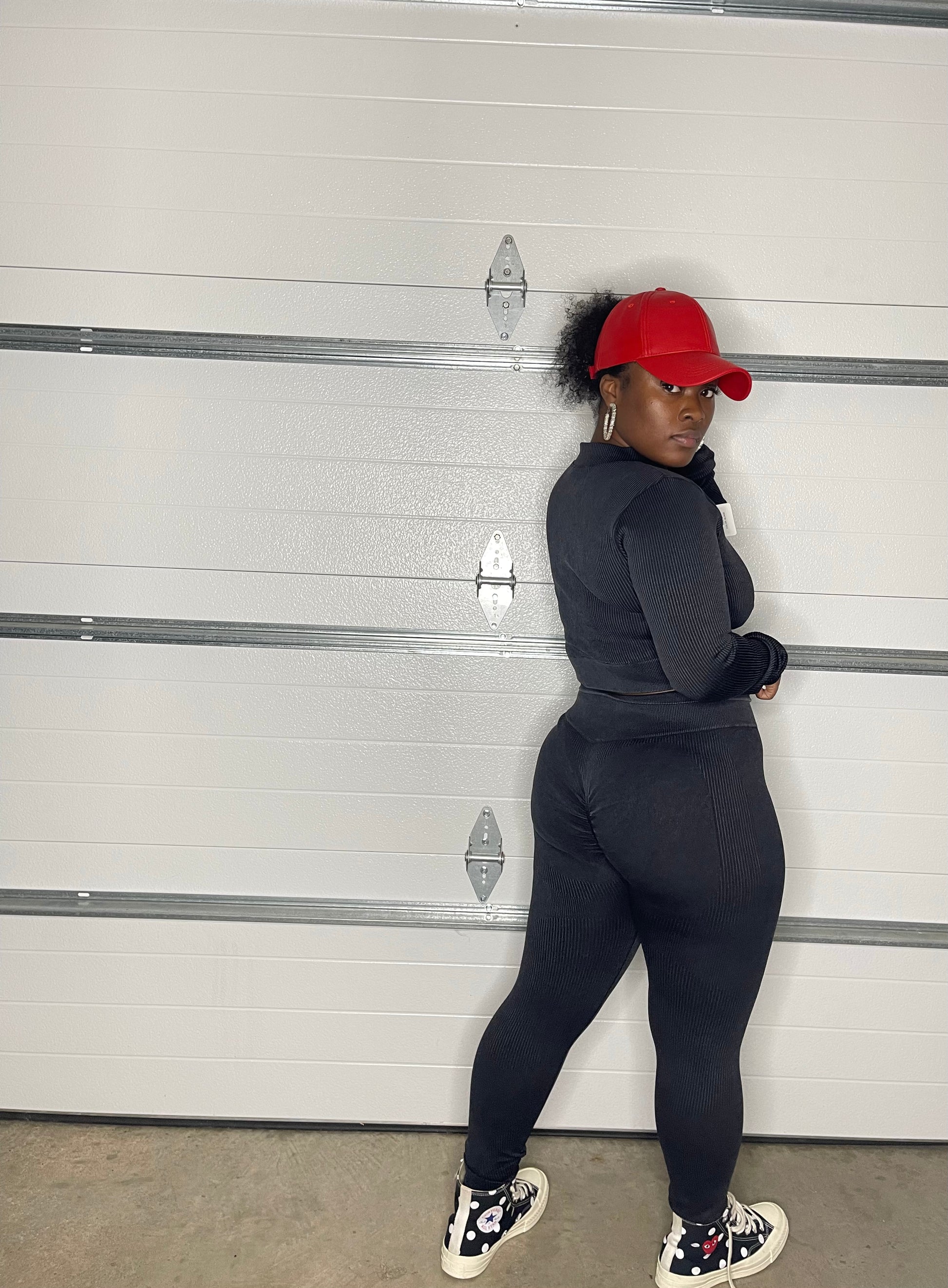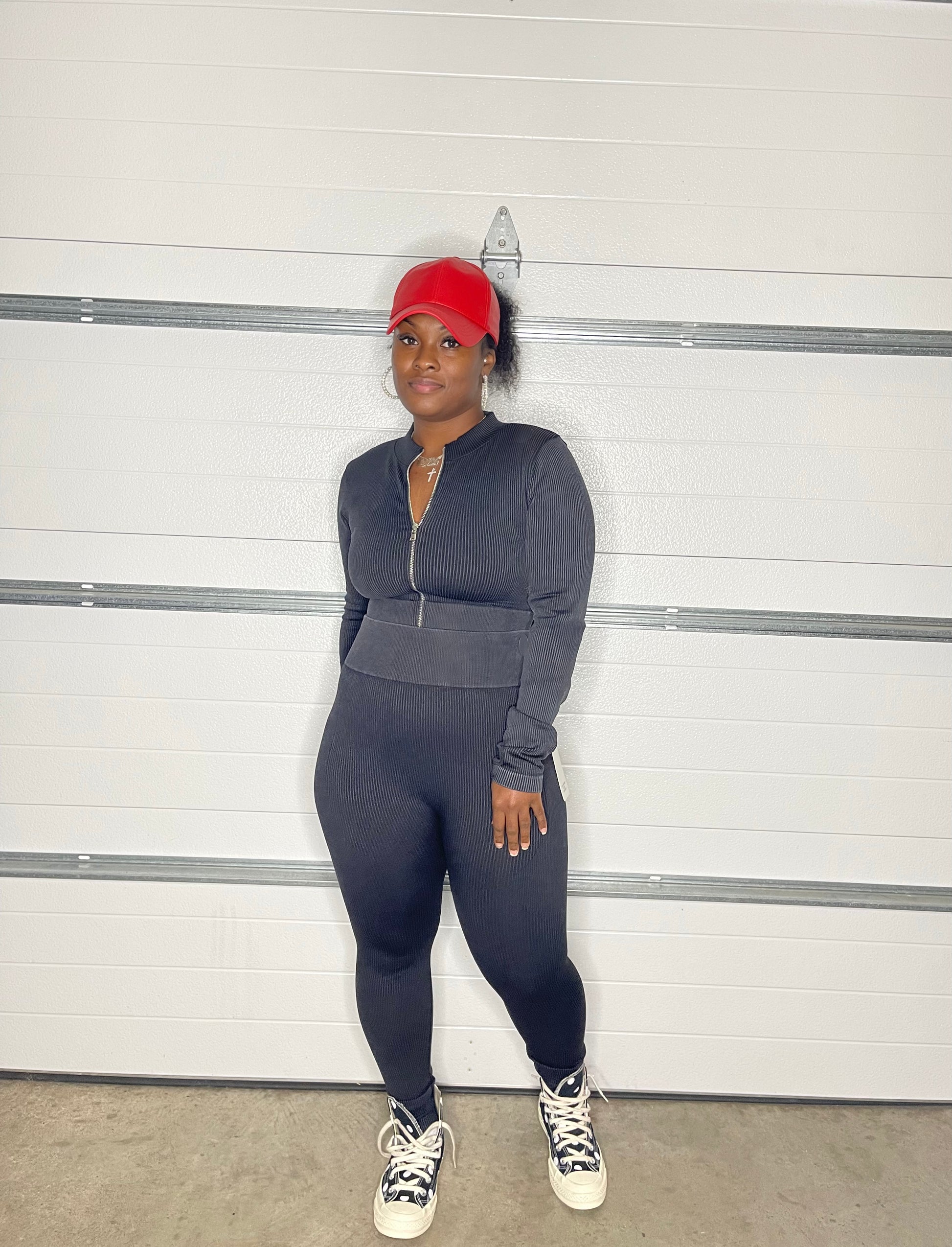 Two- piece mineral wash rib slimming set. Jacket is crop and zips in front with square shoulders and keyhole thumb sleeves. Bottoms high waist with butt lifting sculpture. Great stretch.