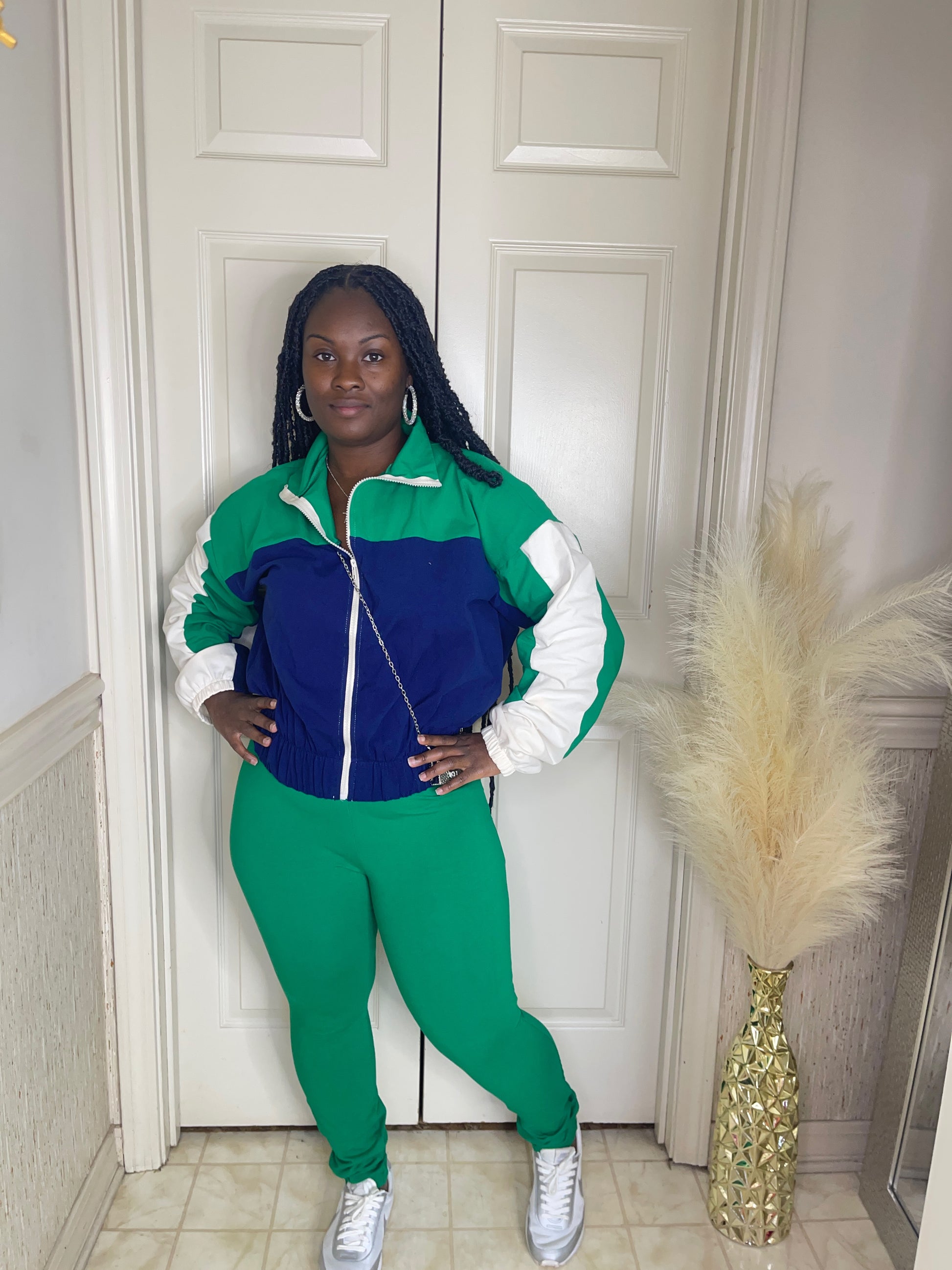 Two- piece color block set. Top: zips in front with matching solid bottoms. Great Stretch.