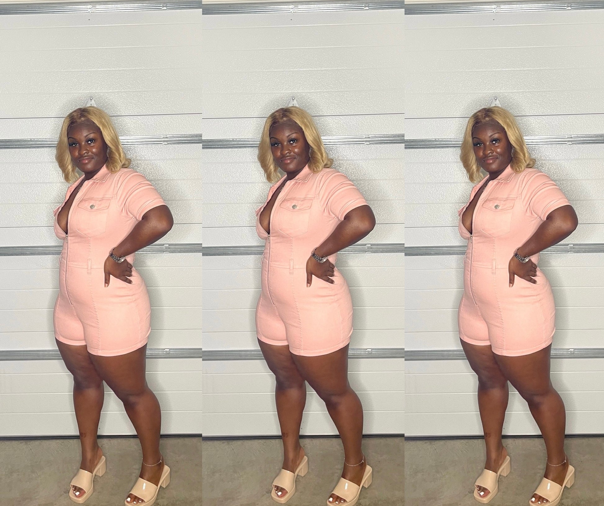 Denim one piece. Zips in front. has stretch