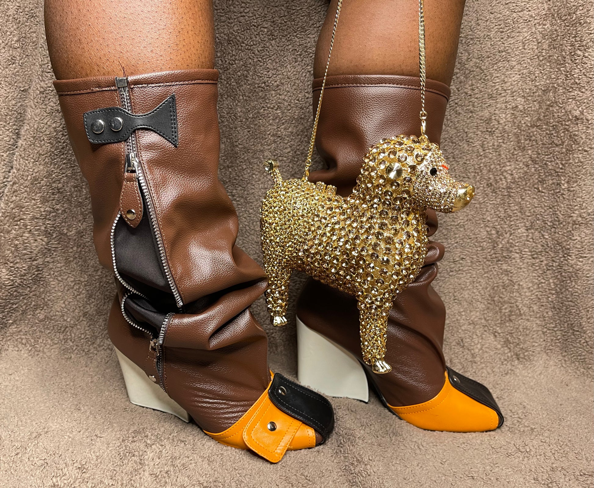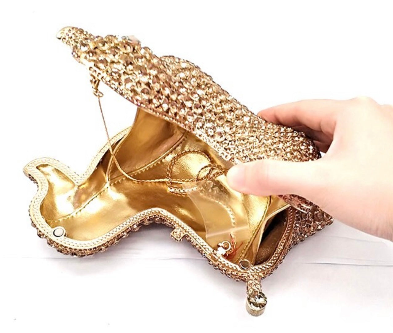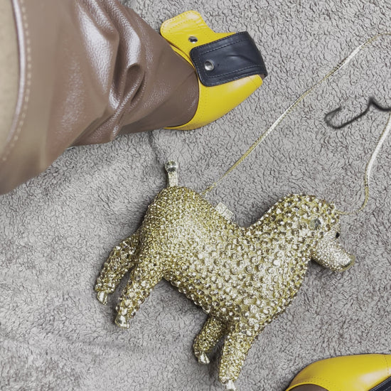 This adorable poodle shaped dog-themed metal clutch is hand decorated by our talented artisans with hundreds of hand set Austrian crystals. This glamorous purse would make a gorgeous accessory for any outfit. A perfect evening bag choice for a wedding, night out on the town, or any formal event. Includes removable chain strap which tucks neatly inside the bag.