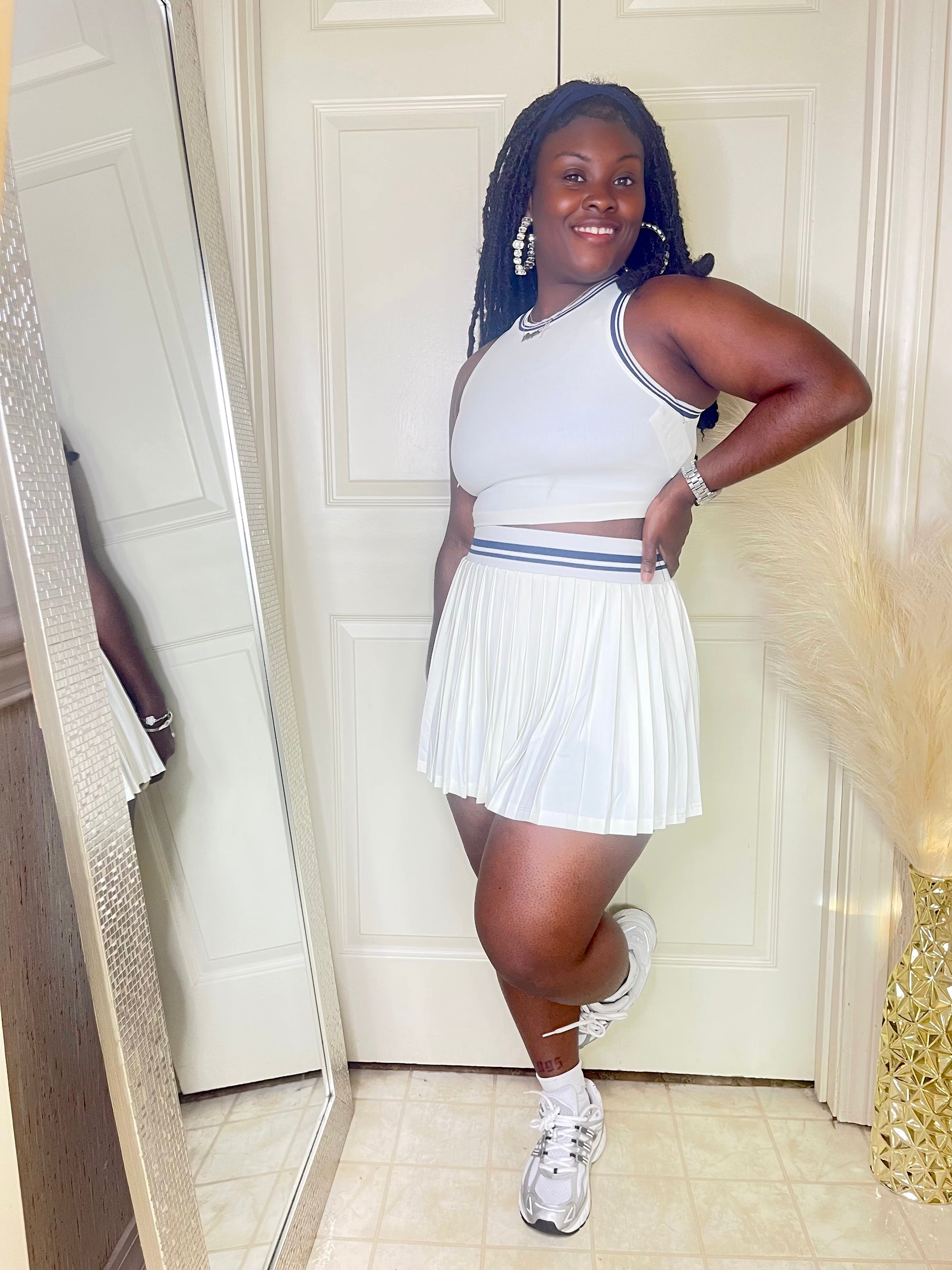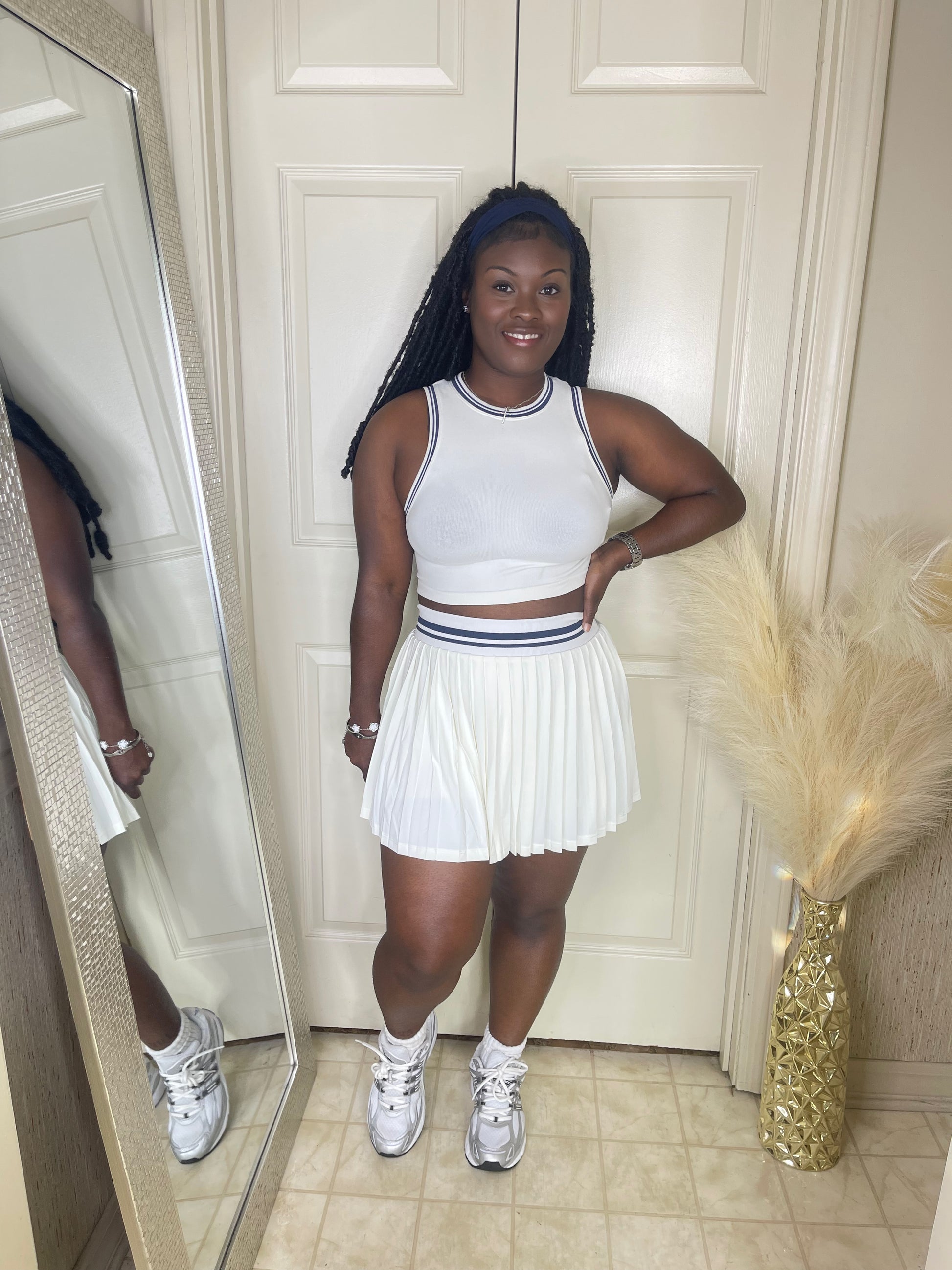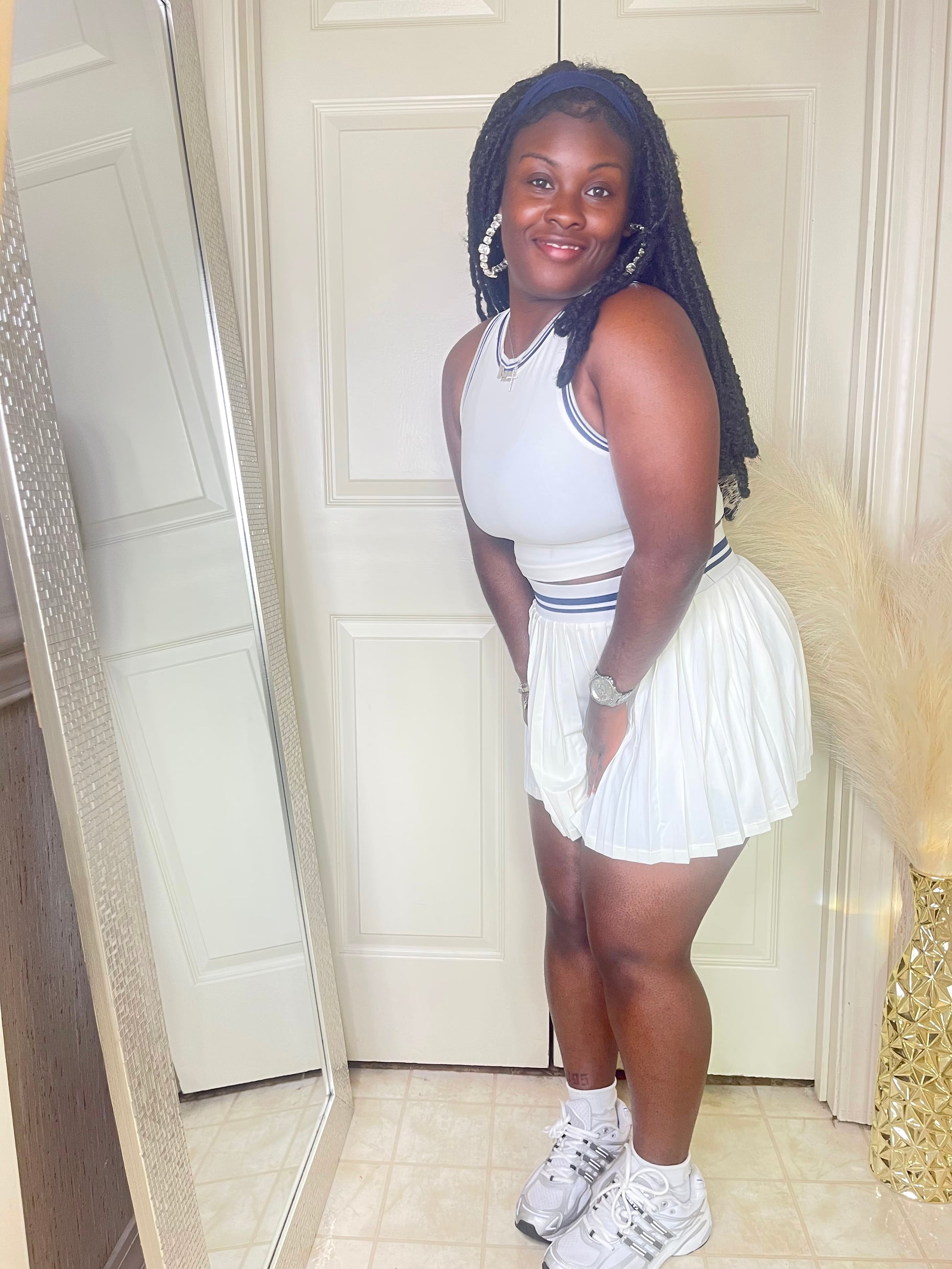 Two-piece skirt set. Blue& White. Top is crop with matching skirt with built in shorts. Has stretch.