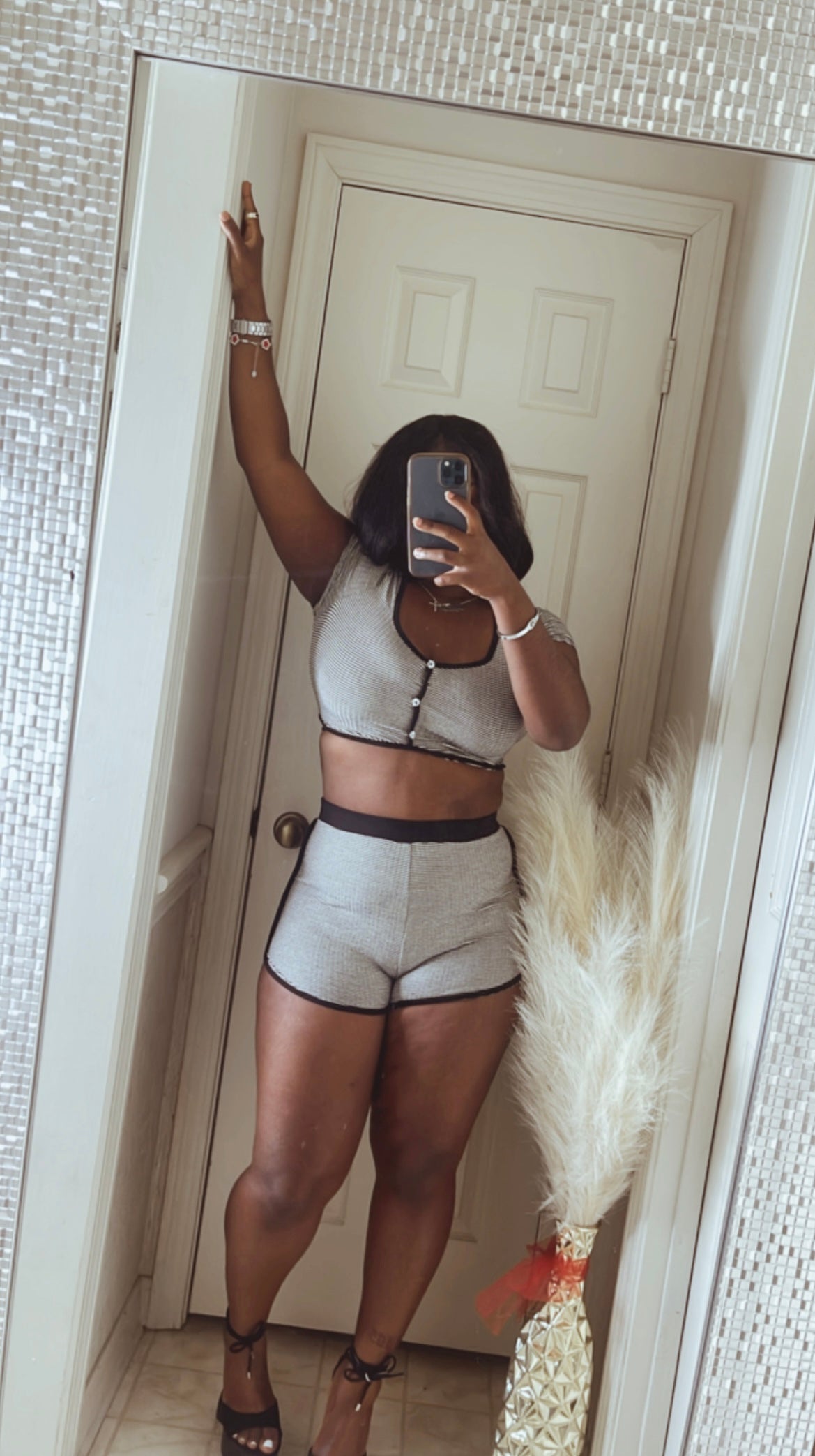 Two piece strips set. Scalloped pull on top with high waist matching bottoms. Good Stretch