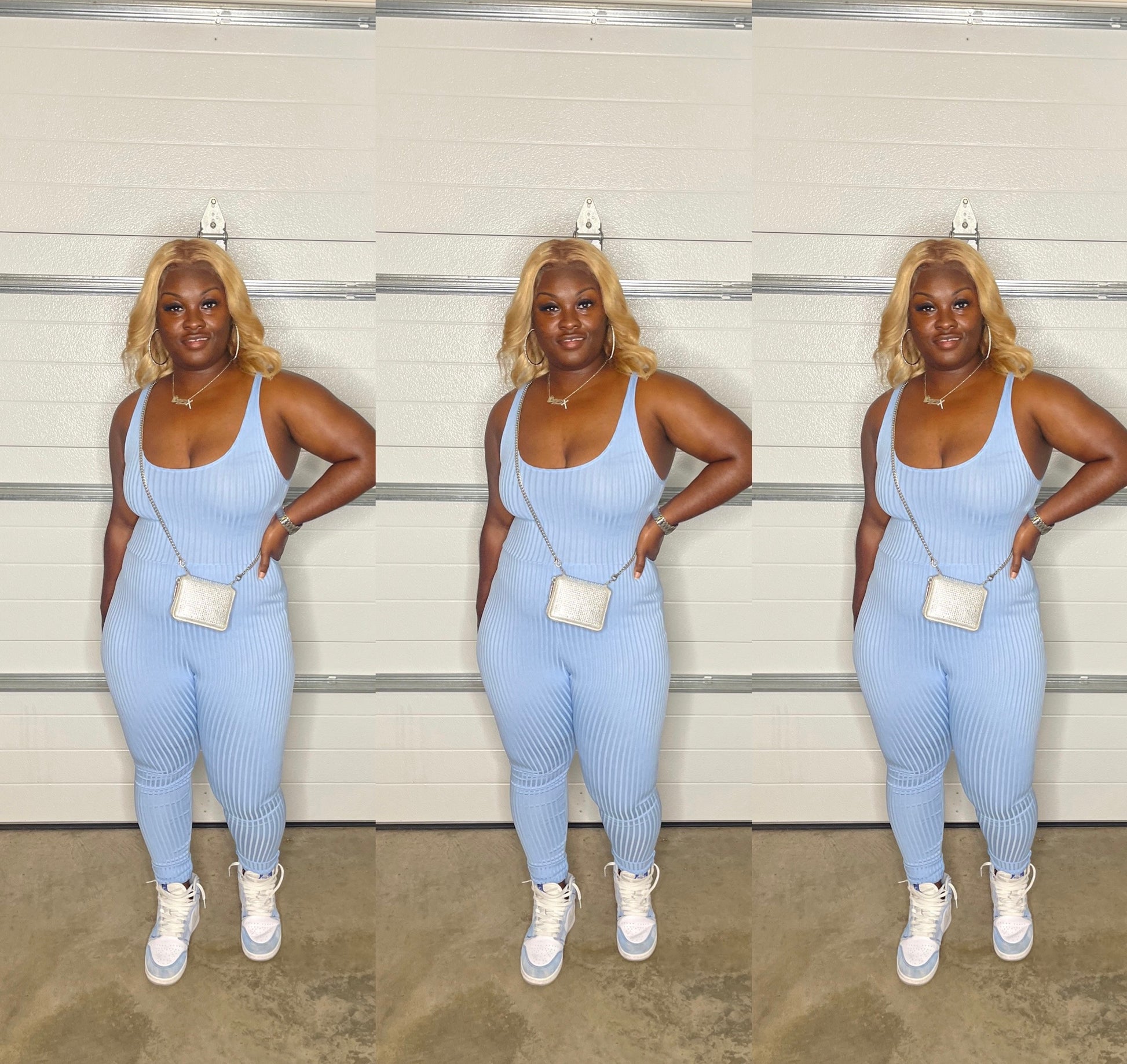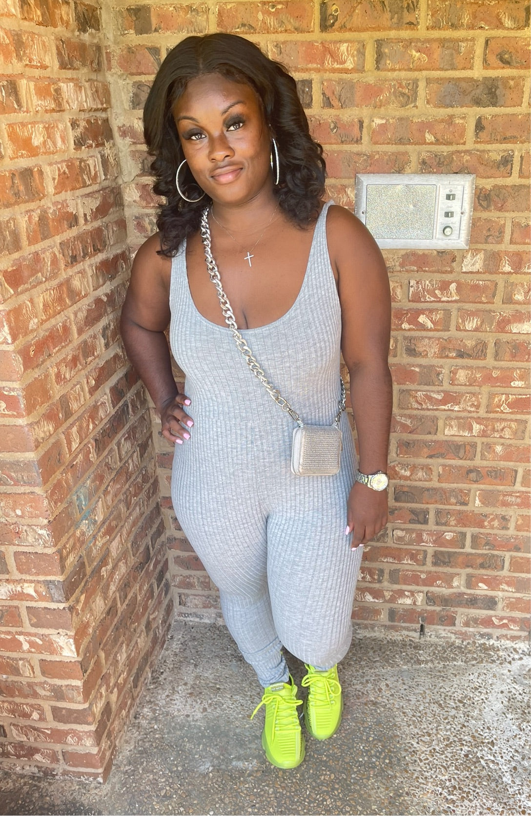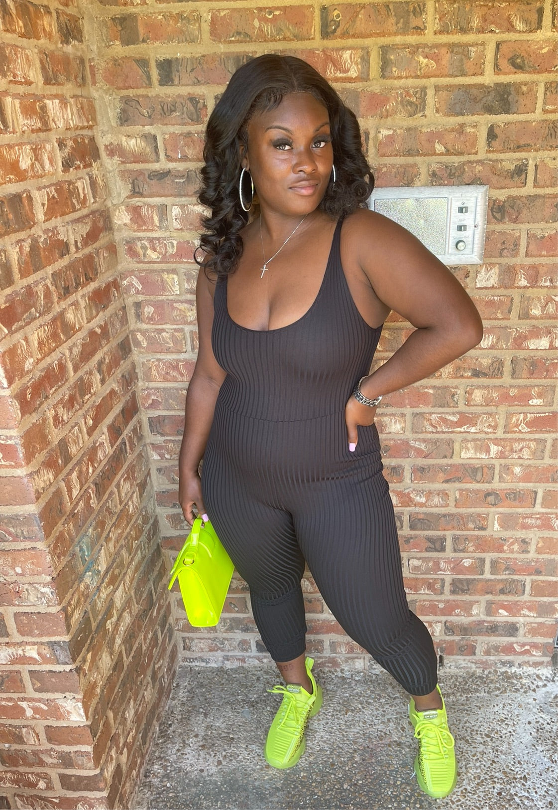 One piece rib knit jumpsuit. Has Stretch.