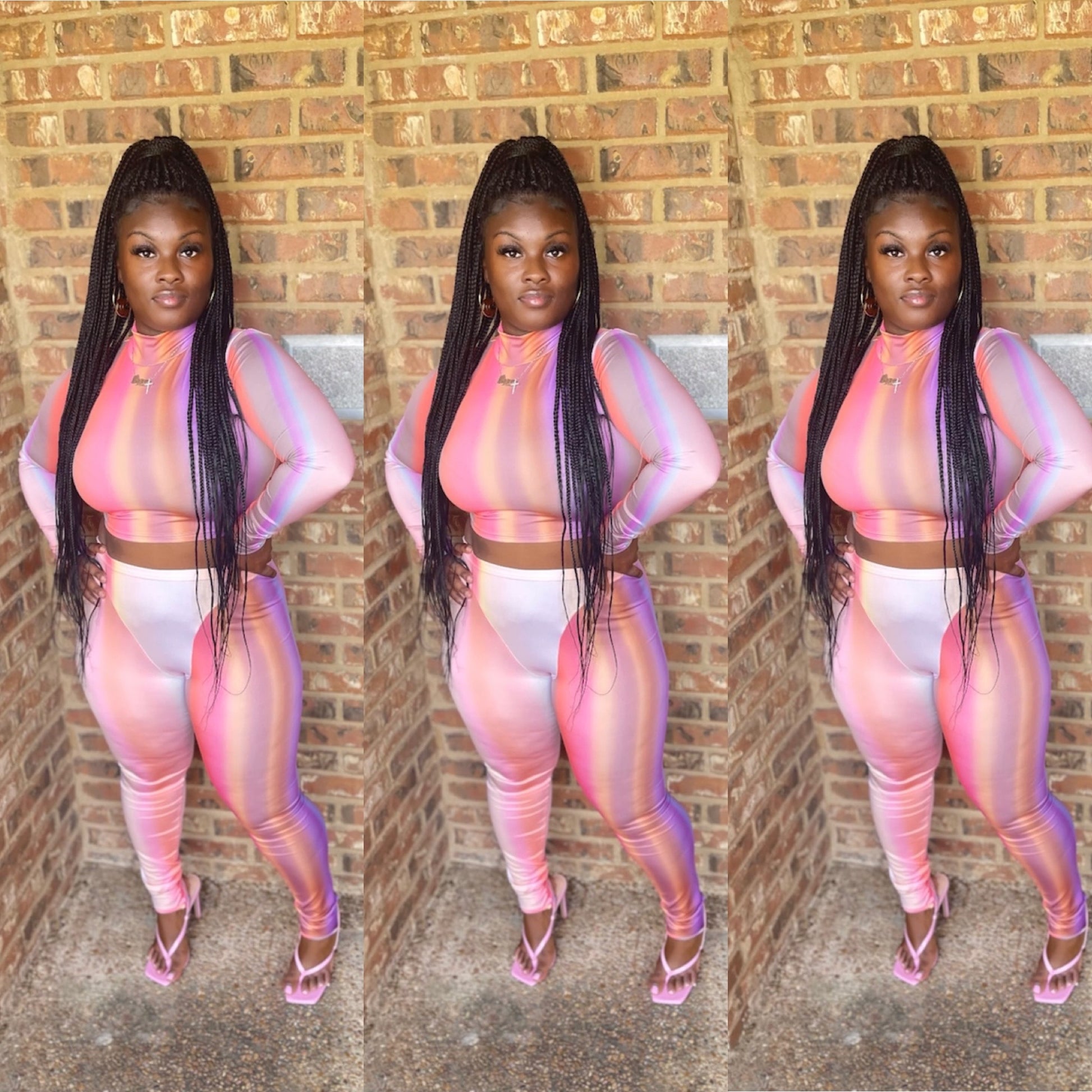 Two-Piece set. Crop top with matching bottom with foot keyhole. Has stretch.