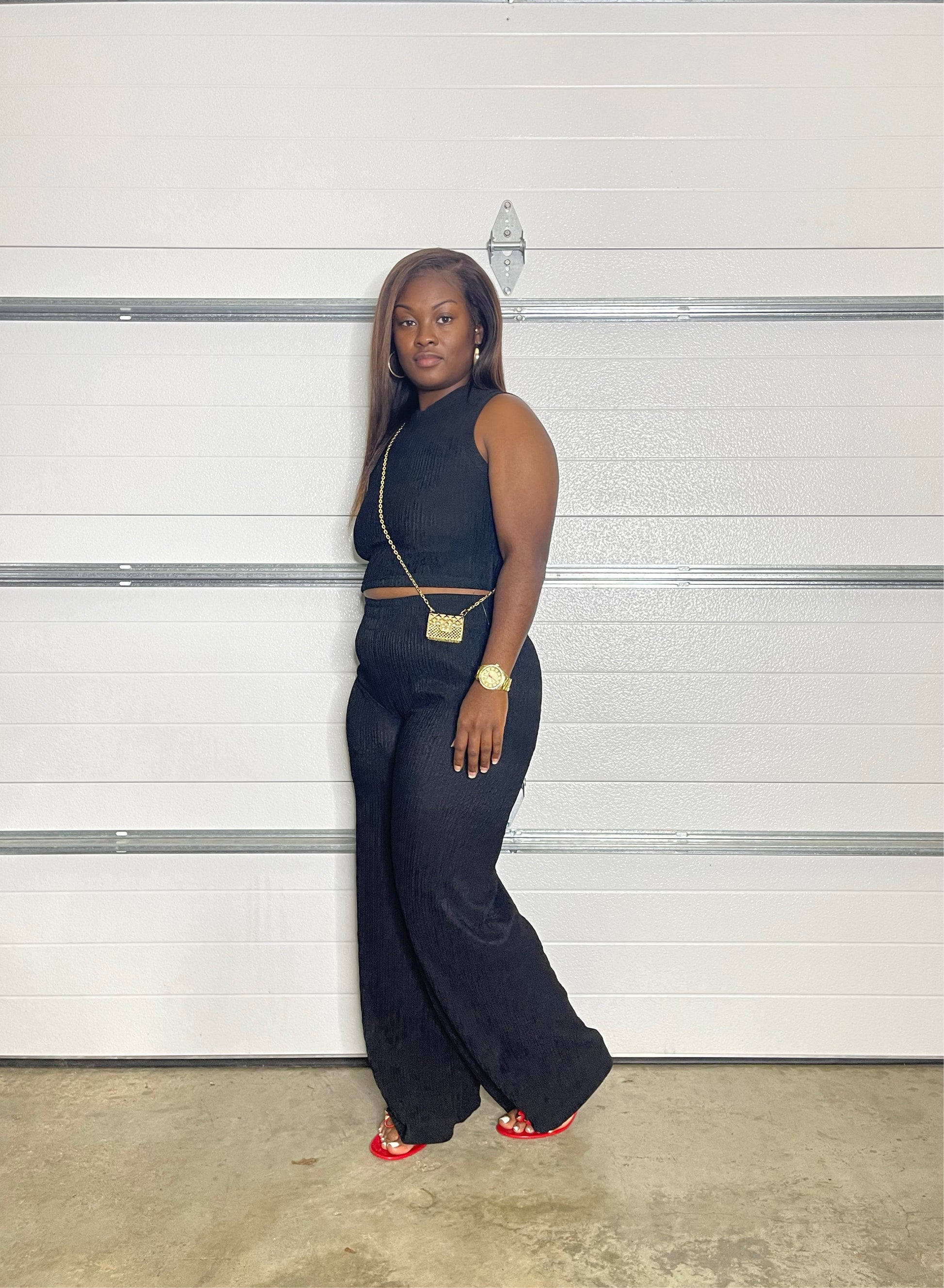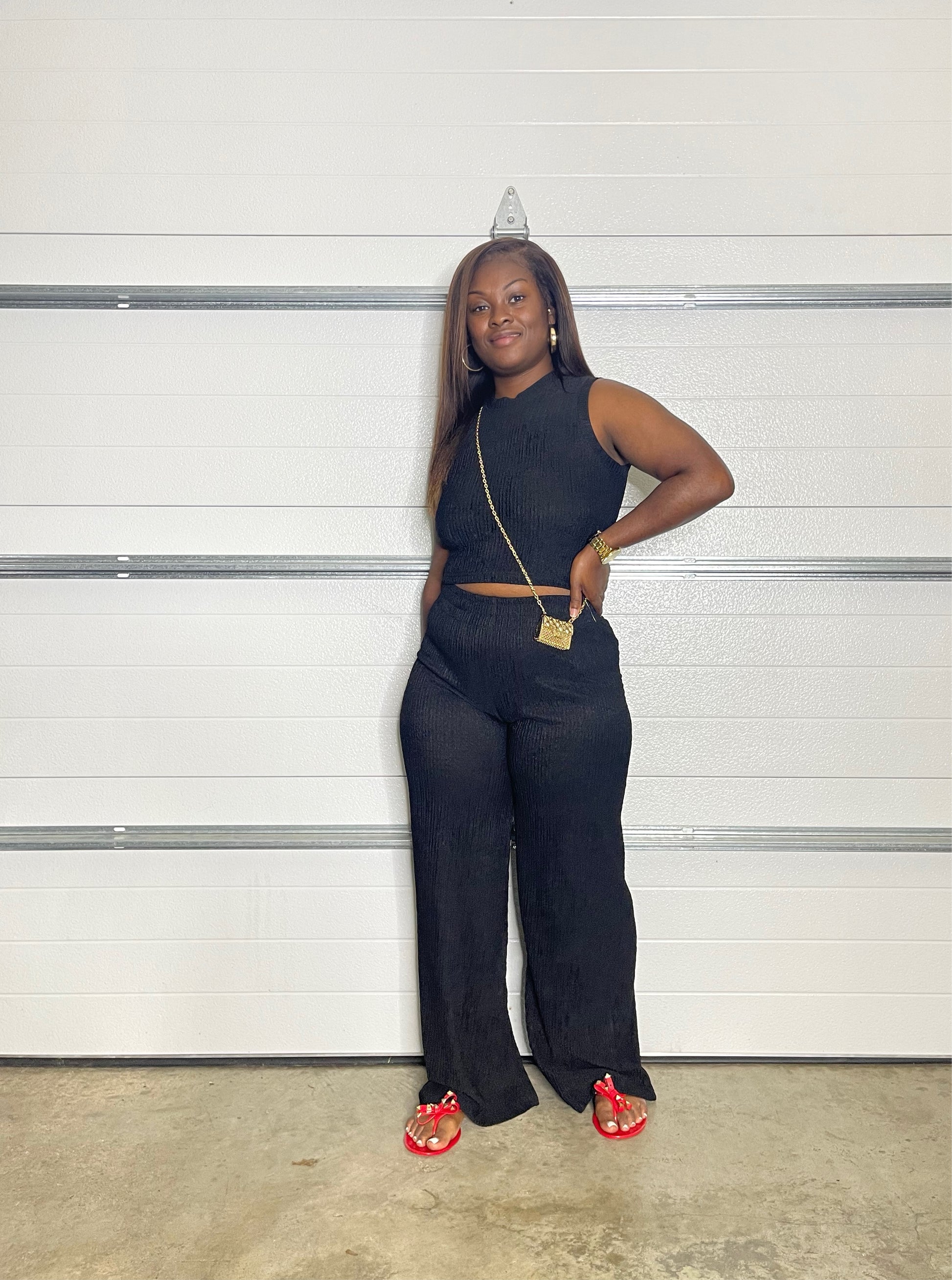 Two-piece plisse texture set. Sleeveless cropped shirt with matching wide leg ankle bottoms. Has stretch.