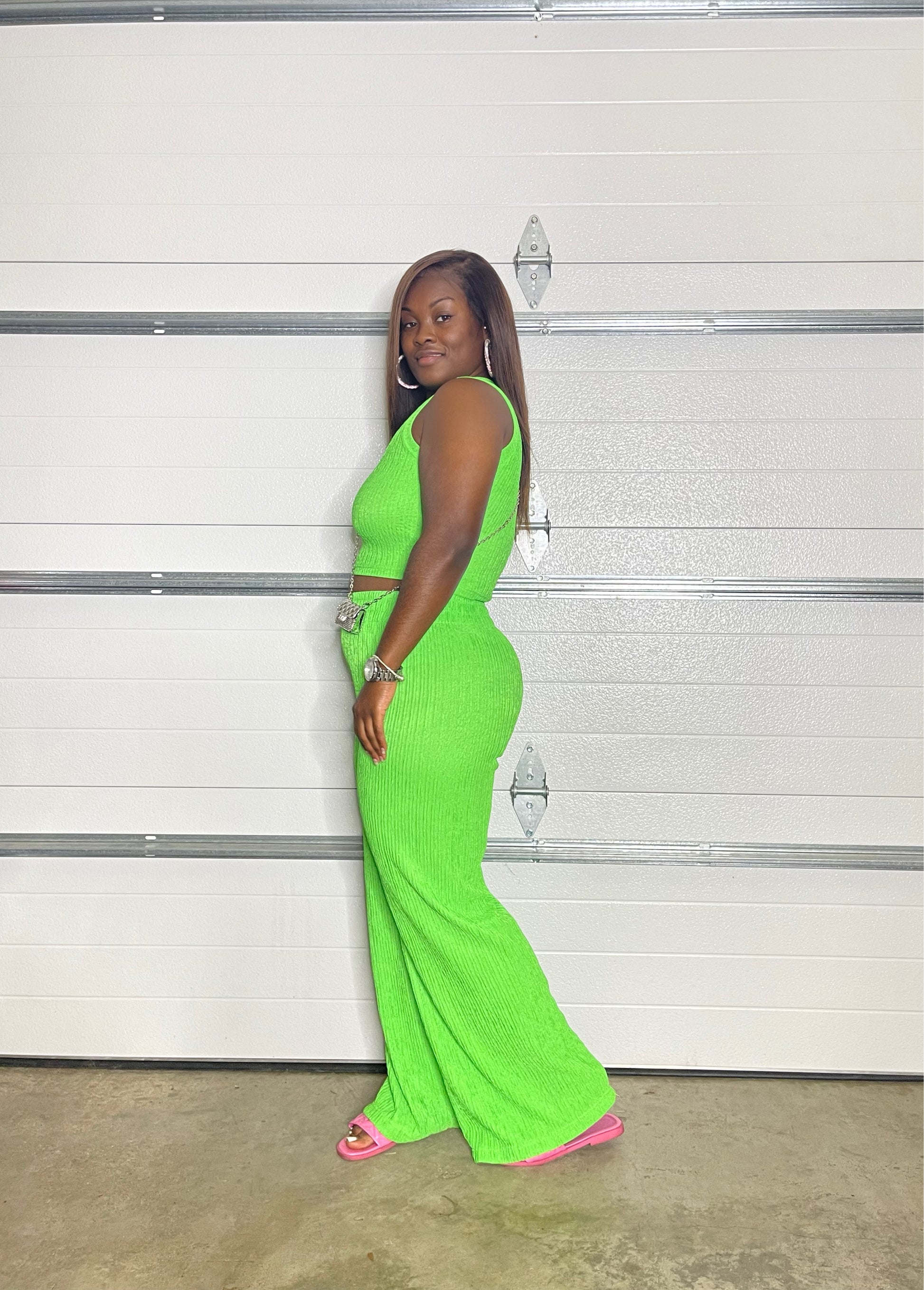 Two-piece plisse textured set. Sleeveless cropped shirt with matching wide leg ankle bottoms. Has stretch.