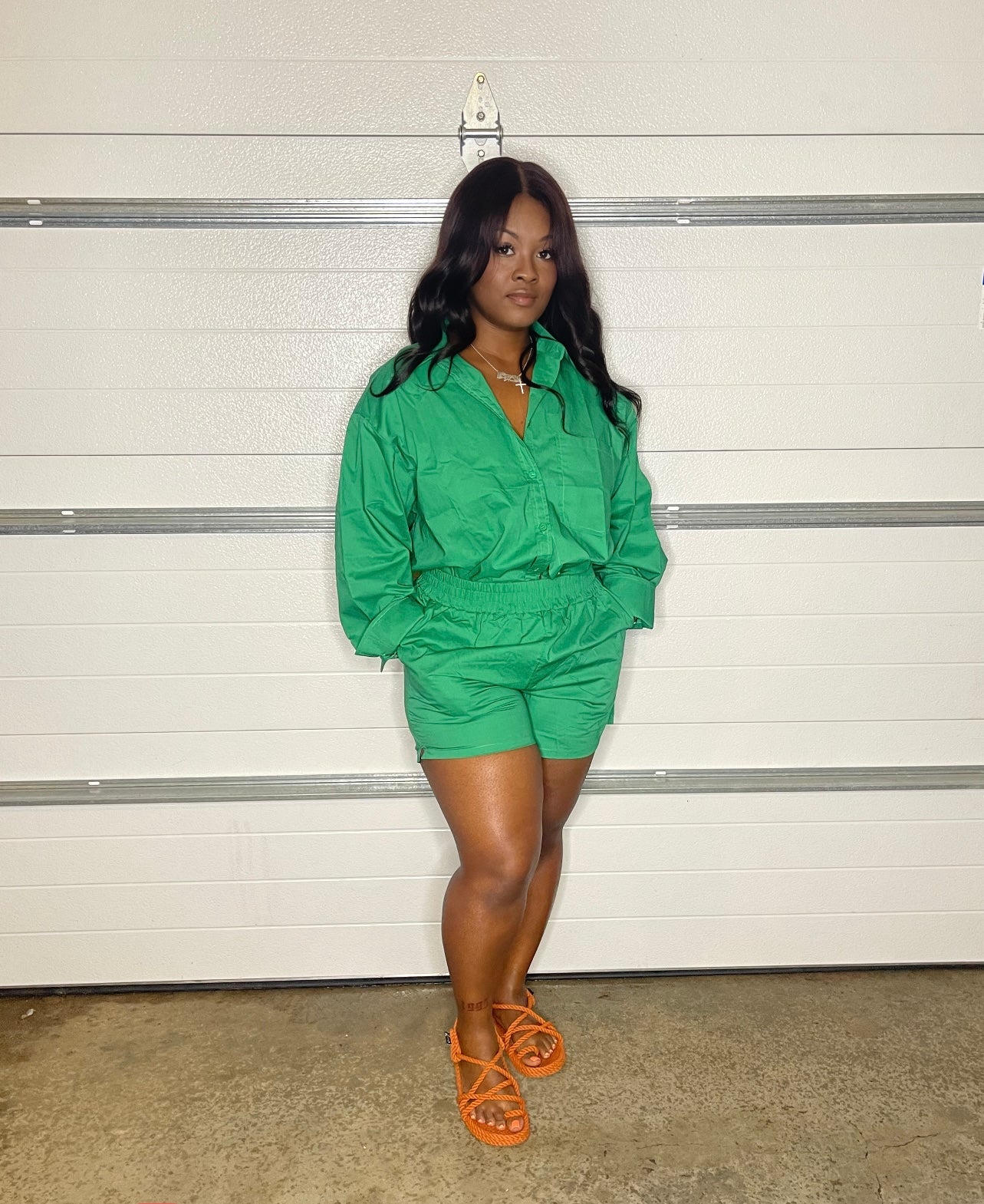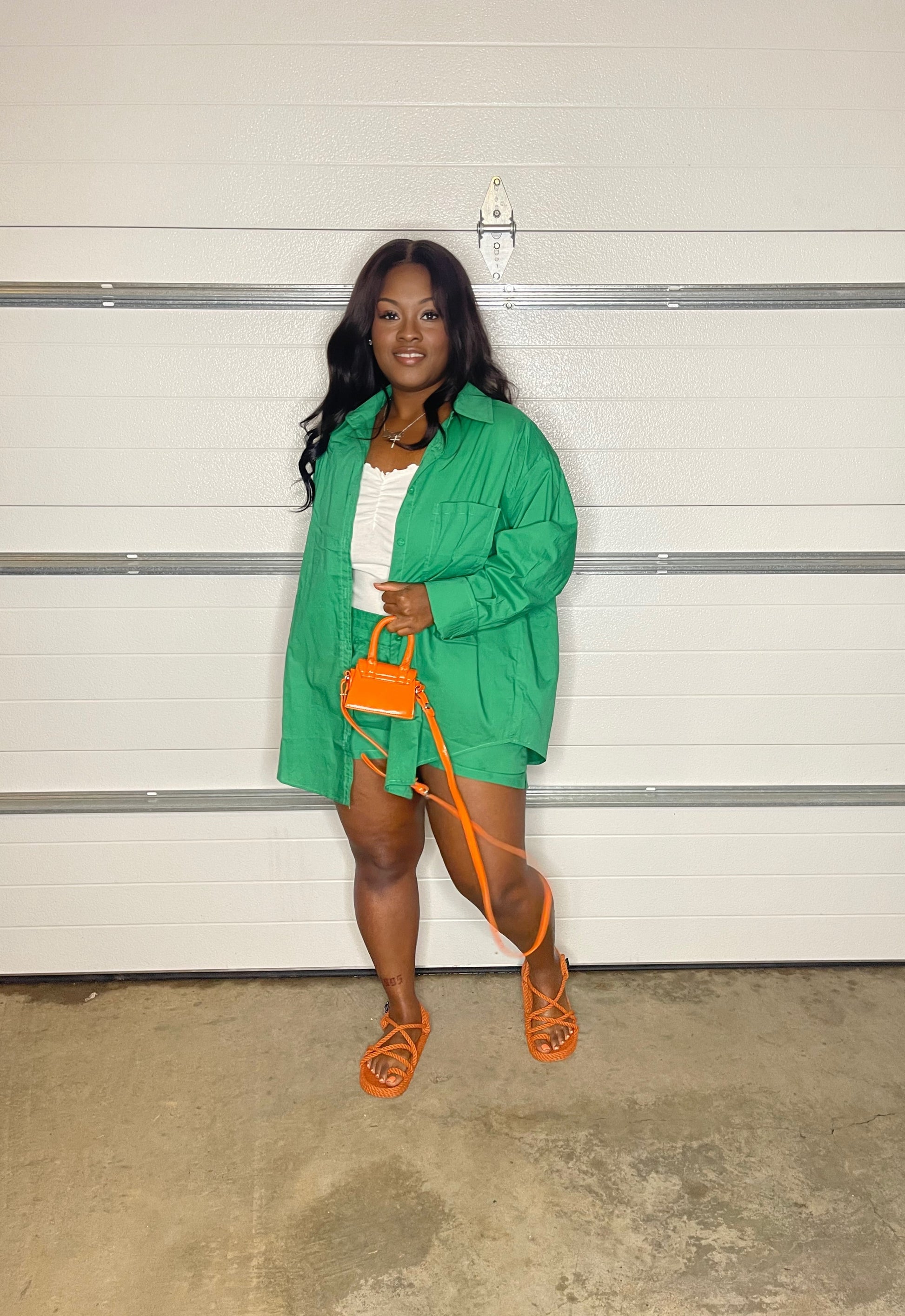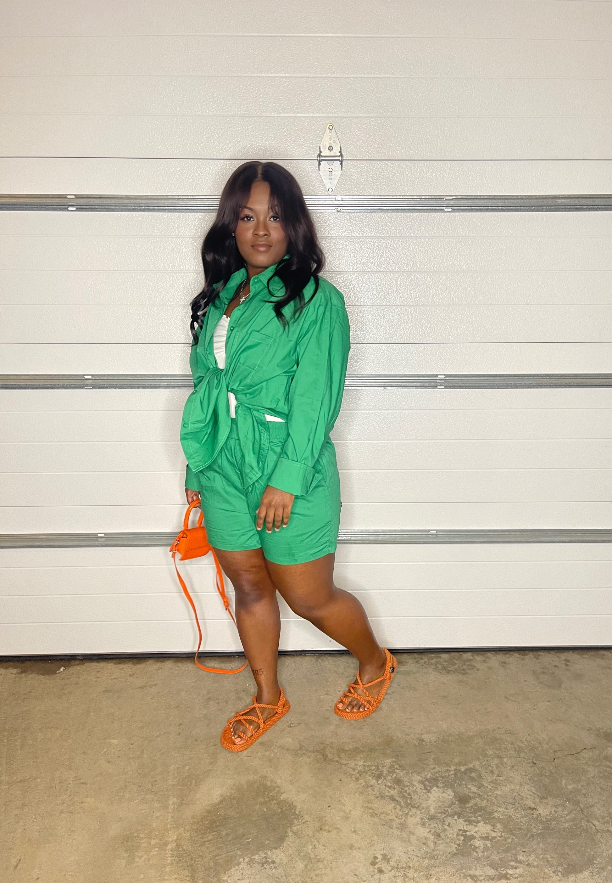 Two-piece set. Oversized button-down long sleeve top with matching adjustable high-waist shorts. Good stretch. Super versatile that can easily be dressed up or down.