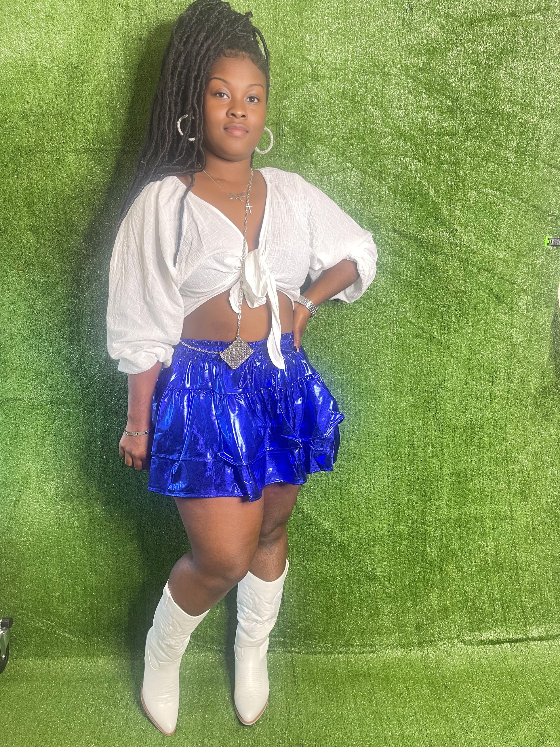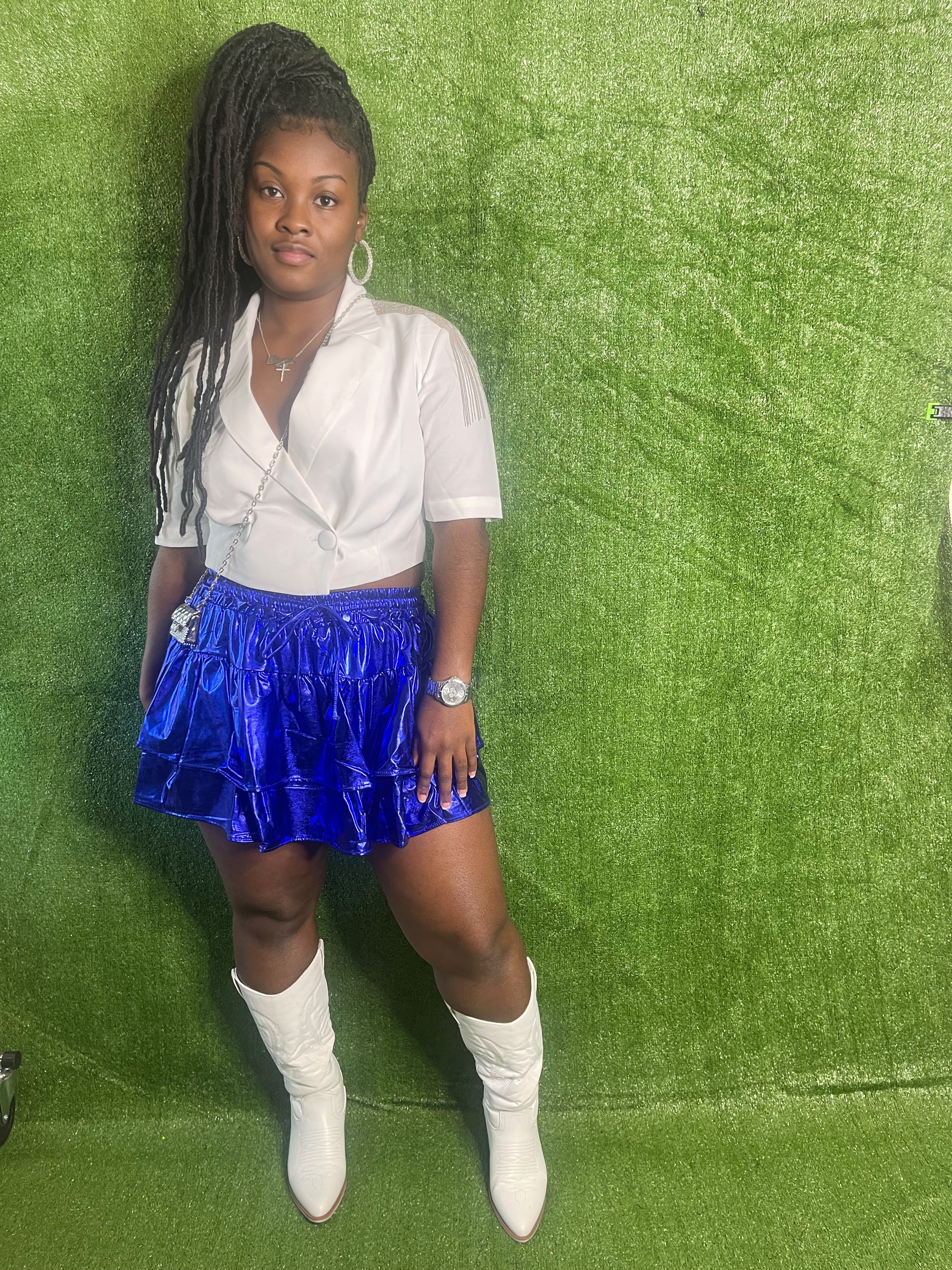 Here for the metallics! Ruffle layer skort. Drawstring waistband.