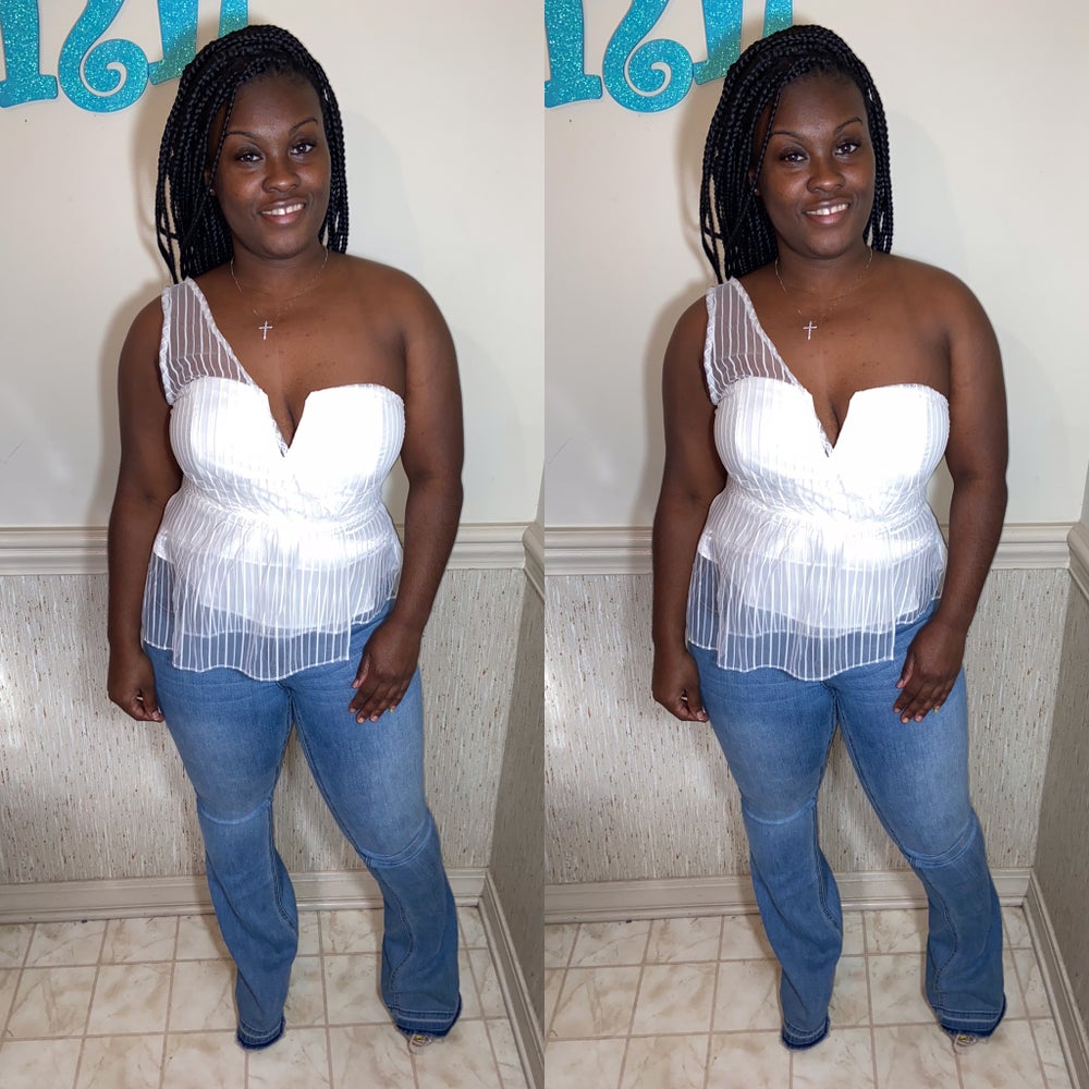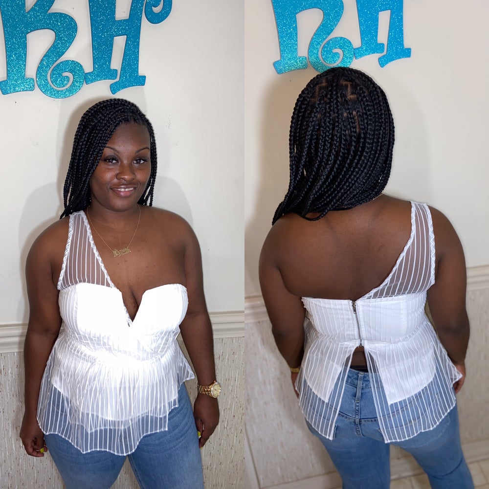 One shoulder blouse with build in wire bra. Zips in back with opening in back